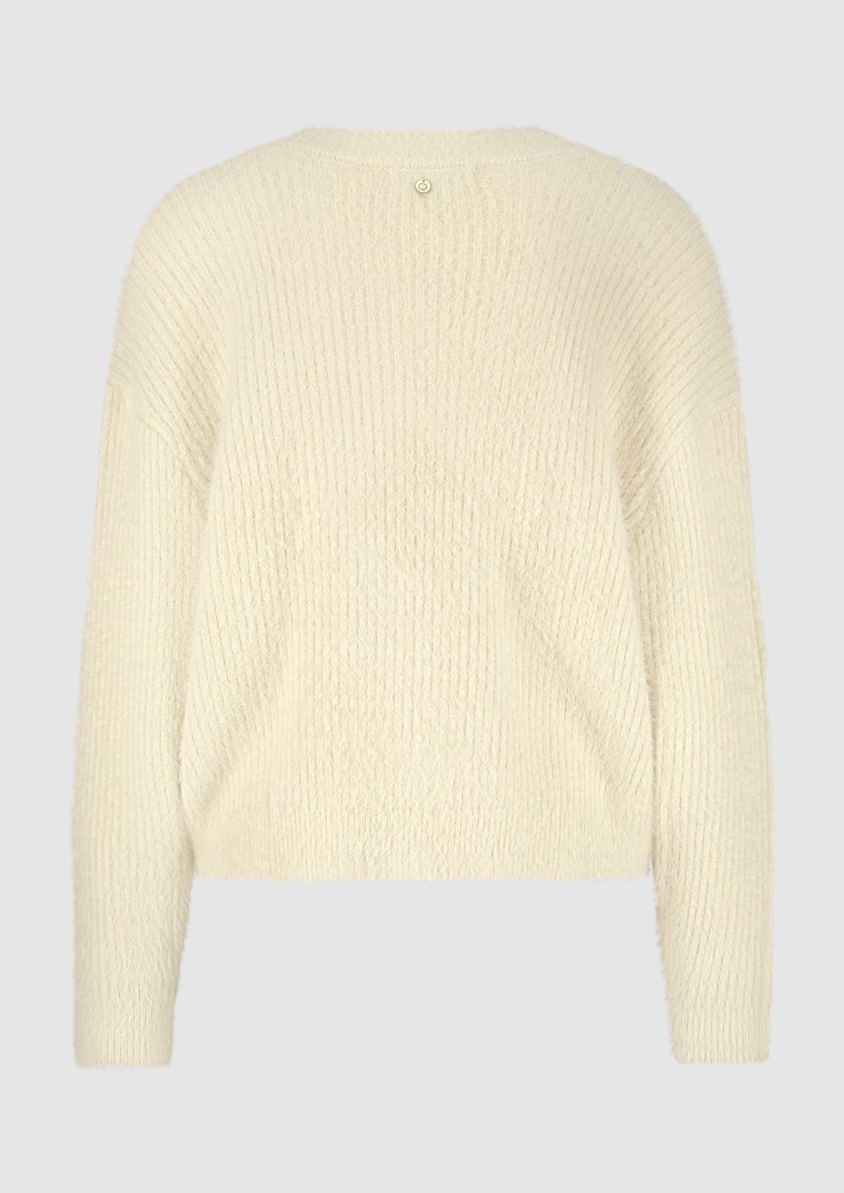 Gebreid damesvest met hairy structuur, uitgevoerd in crème. De Audrey cardigan heeft een loose fit, ronde hals, knoopsluiting en strepen.