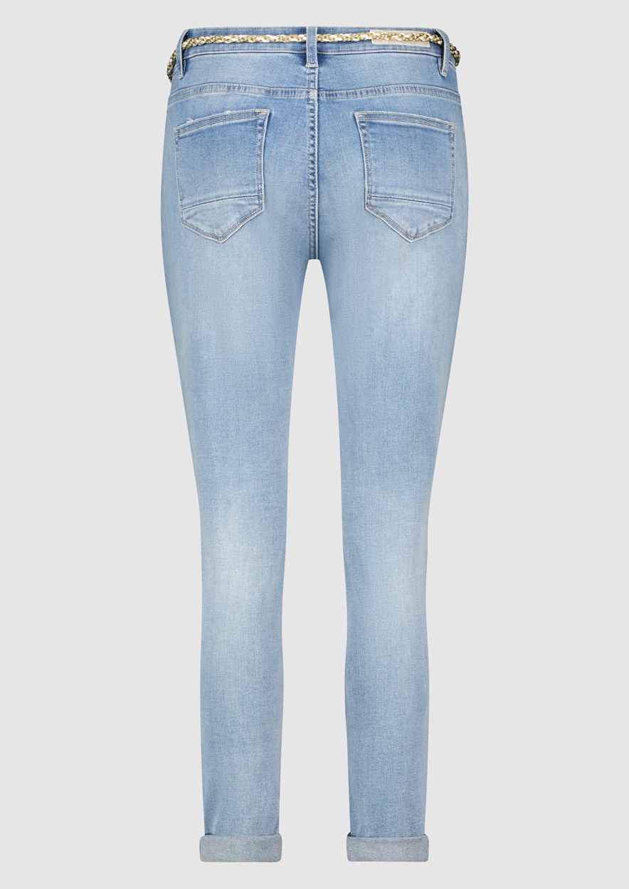Skinny boyfriend fit denim met een mid-rise. De Cooper is gemaakt van stretch katoen in een lichtblauwe wash wordt geleverd met een gevlochten riempje.