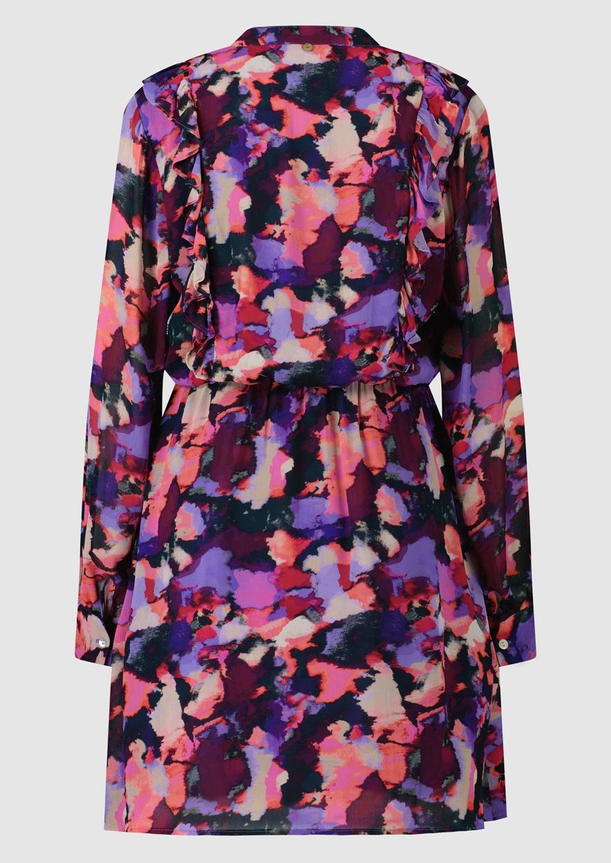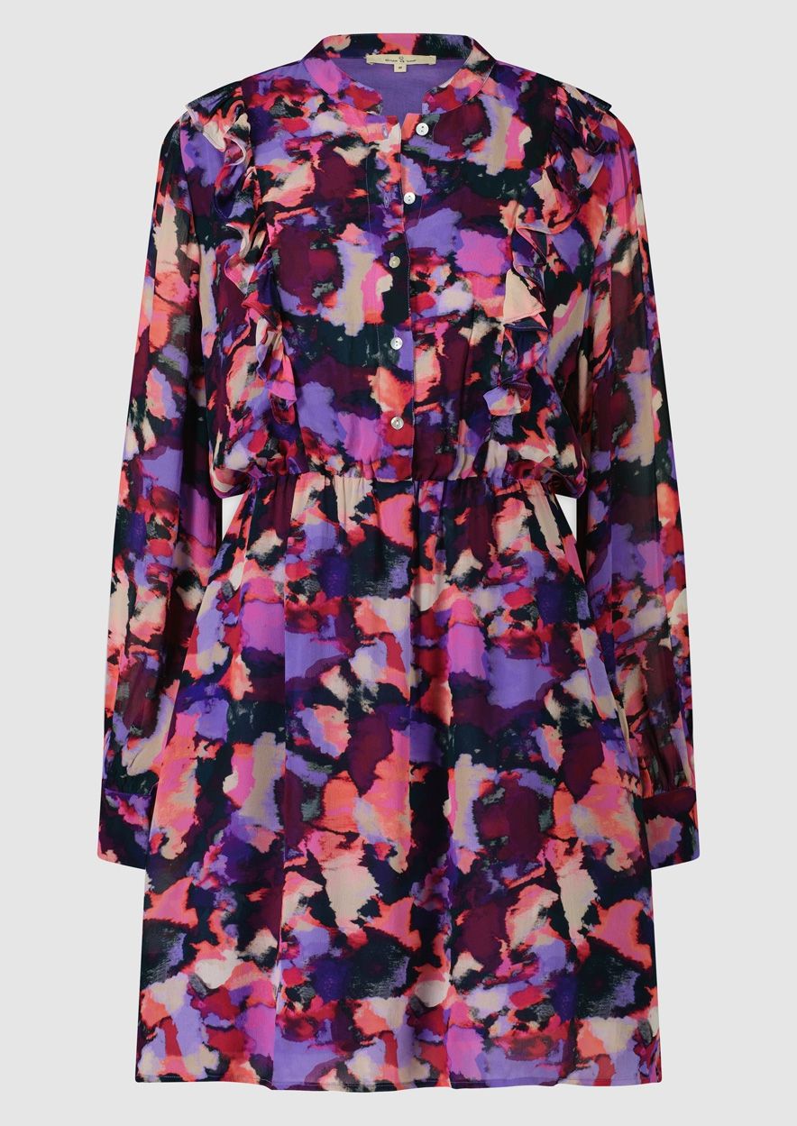 Zachte chiffon jurk met kleurrijke print met paarse en roze tinten. De Floor dress heeft een regular fit met een korte knoopsluiting, een elastische tailleband en ruche details. Materiaal: 100% viscose, onderrok: 100% katoen