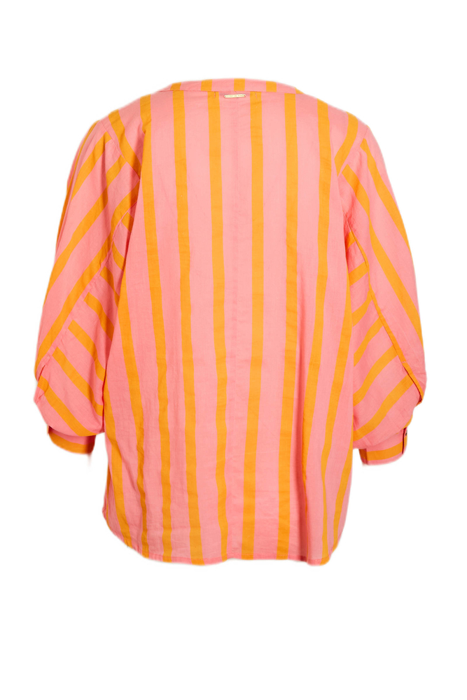 Kleurrijke oversized blouse in oranje en roze strepen met een bijpassend ceintuur om het model te tailleren. De Libby blouse heeft een v-hals en een knoopsluiting op de voorkant.
