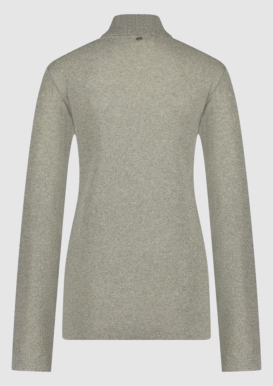 Dames top met een aangesloten fit en een colkraag, uitgevoerd in een lichtgrijze tint. De Taylor top heeft een metallic gouden draad erin geweven en een subtiele split aan de mouwuiteinden.