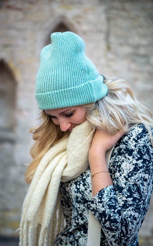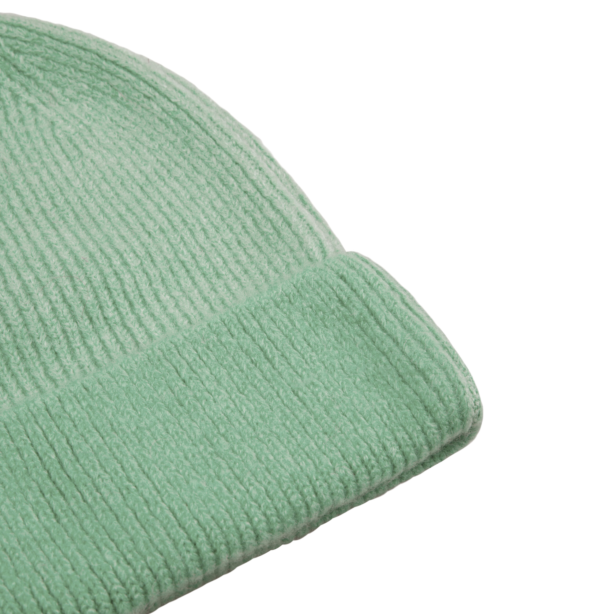 Deze gebreide muts heeft een fijne rib, zachte stof en een omgeslagen detail.