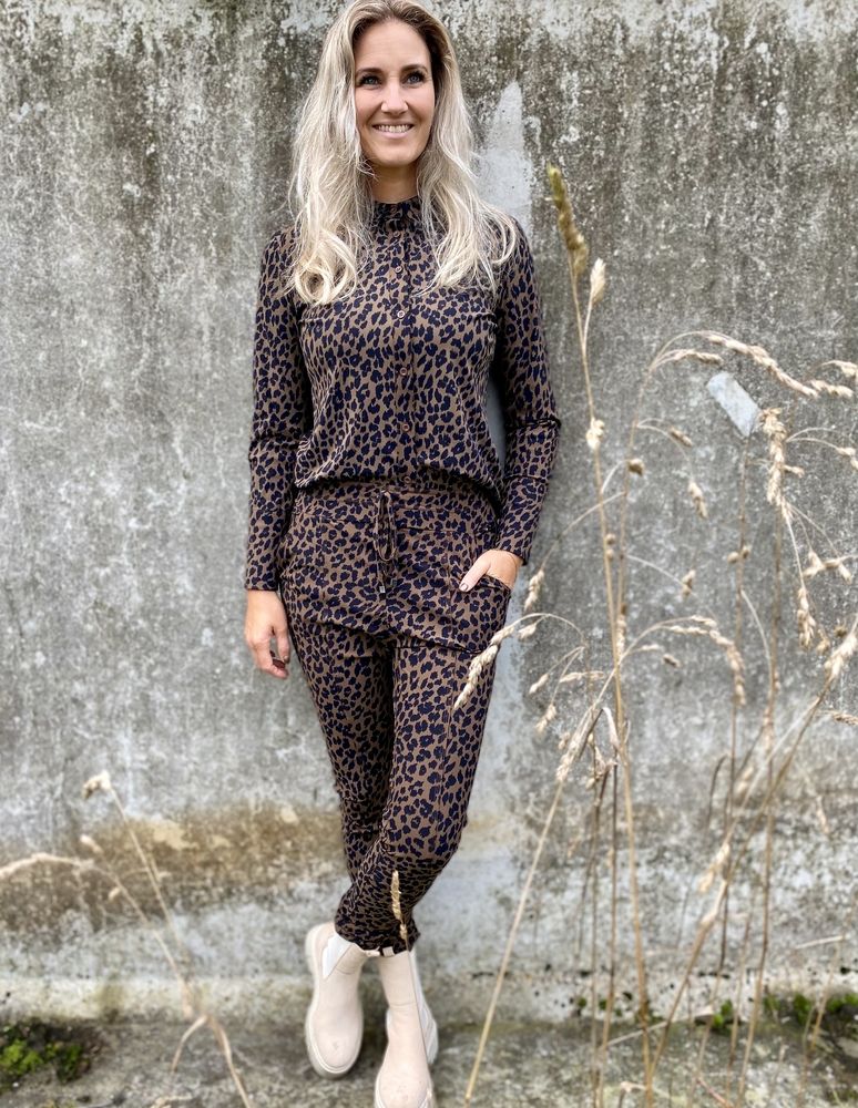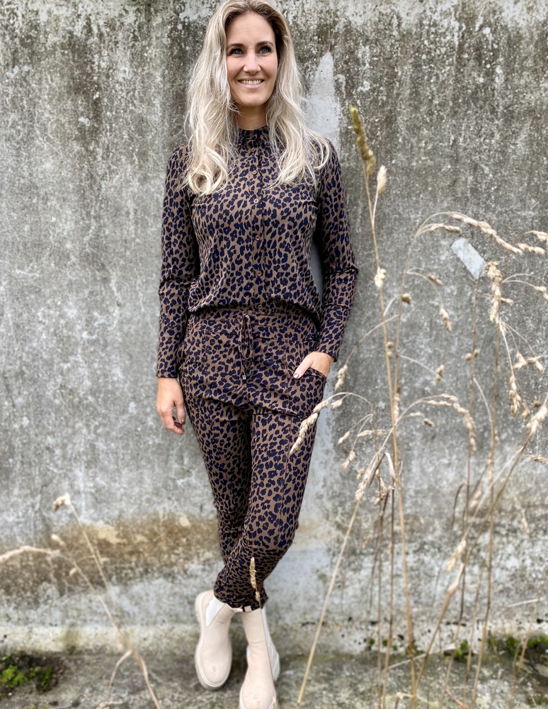 Deze pantalon heeft een mooie zwart bruine print en bestaat uit travel kwaliteit.