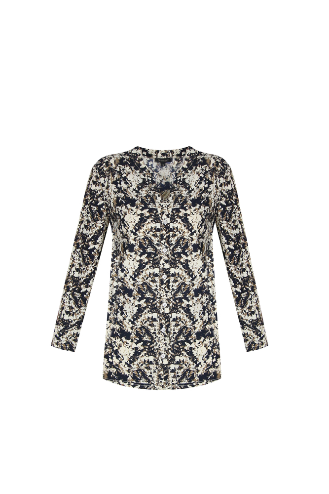 De blouse heeft driekwart mouwen en een knoopsluiting.