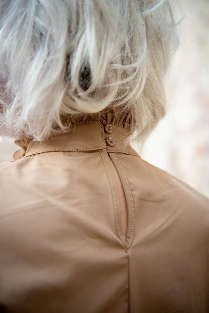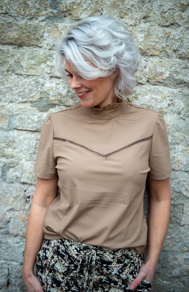 De Latoya top heeft korte mouwen met een subtiele pof op de schouders. De top heeft een turtle nek (sluit achter met een knoopje) met aangerimpelde boord aan de hals. Op het voorpand heeft deze top een mooi opengewerkt detail. Gemaakt van fijn travel kwaliteit.
