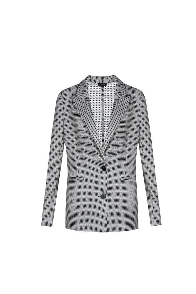 De blazer heeft lange mouwen en een reverskraag en voorzien van twee knopen en paspelzakken voor.