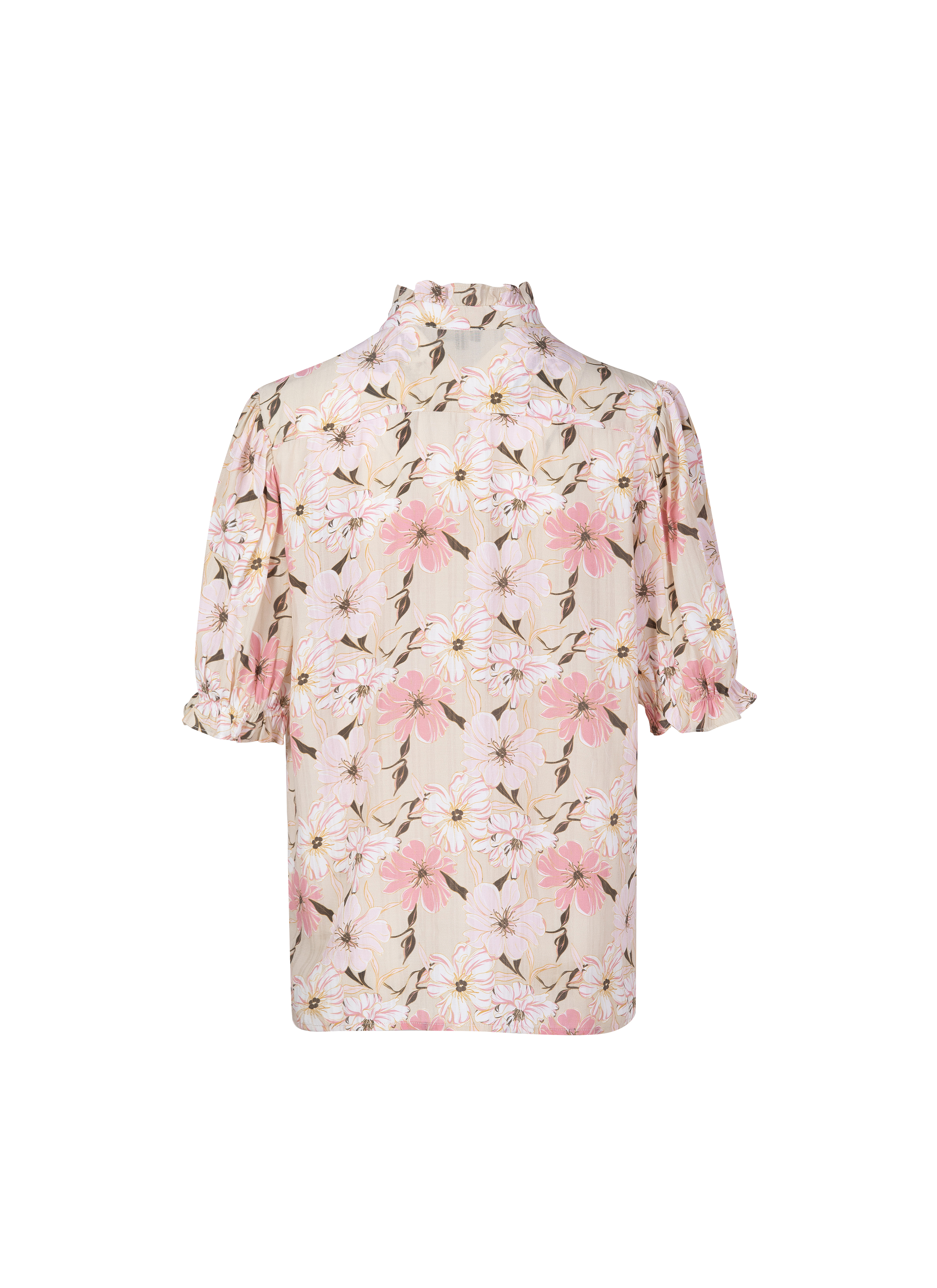 De Linde blouse heeft een all-over bloemenprint en korte mouwen met aan de uiteinde elastiek.
