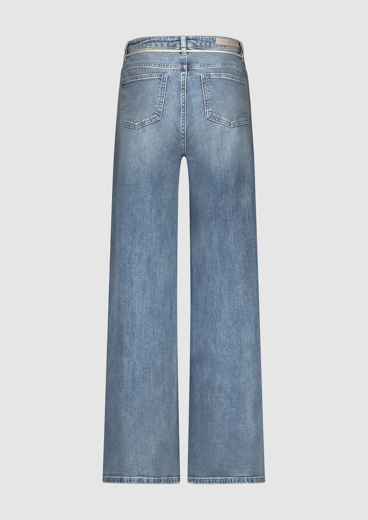 Wide leg mid-rise jeans met een vleugje stretch voor dames. De Jona jeans heeft een 5-pocket design en is voorzien van een stoffen ceintuur. Uitgevoerd in een blauwe tint met een opvallende fade.