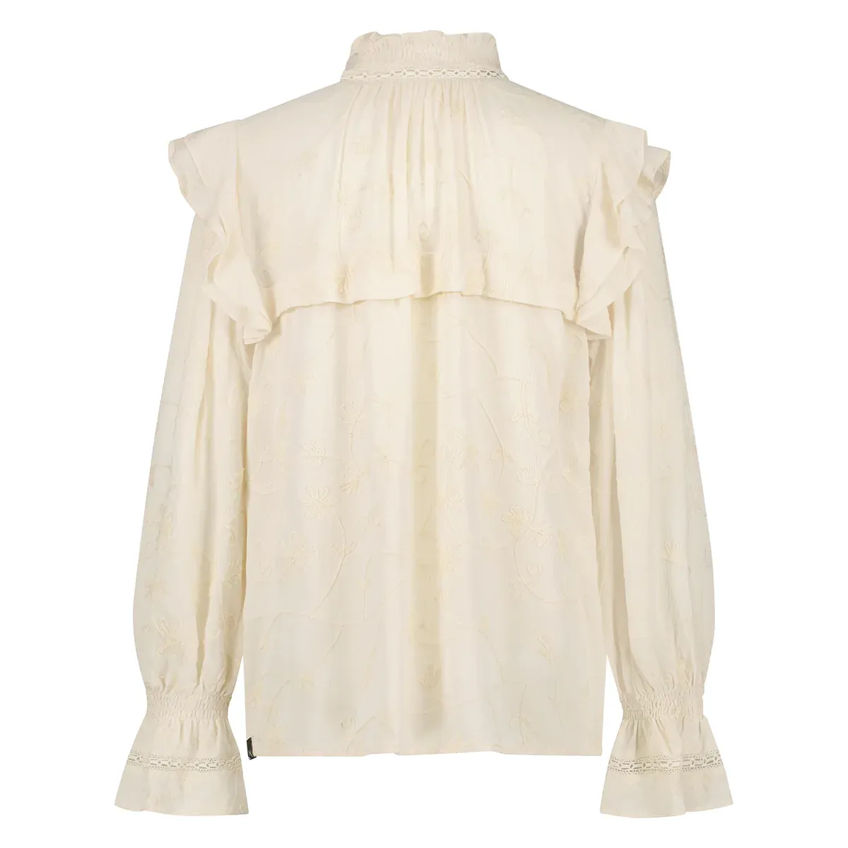 De Ada blouse heeft een allover print en een opstaand kraagje met plofmouwtjes. De blouse heeft lange mouwen en ruffels op de schouders. De blouse heeft een leuk detail op de mouw en op de kraag.