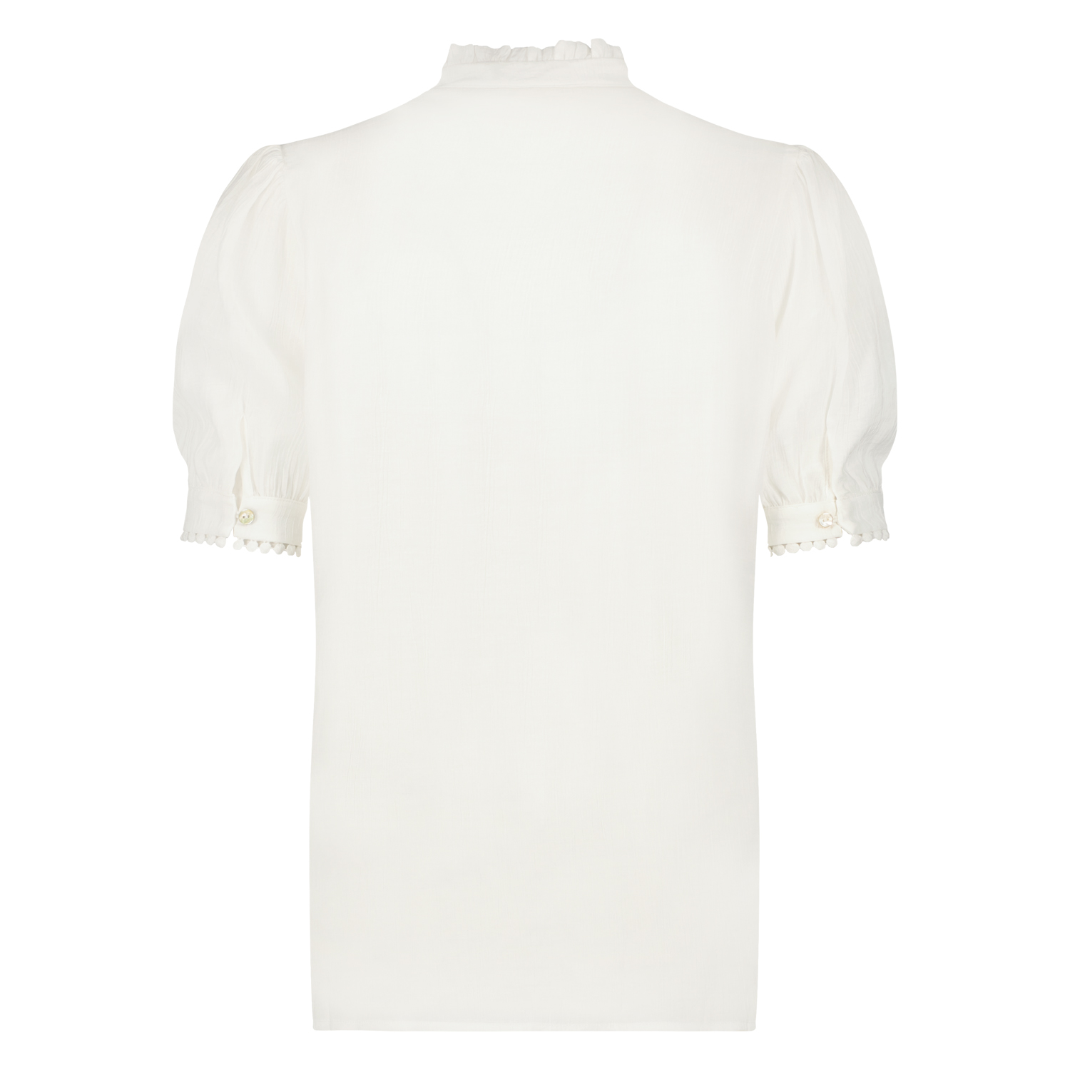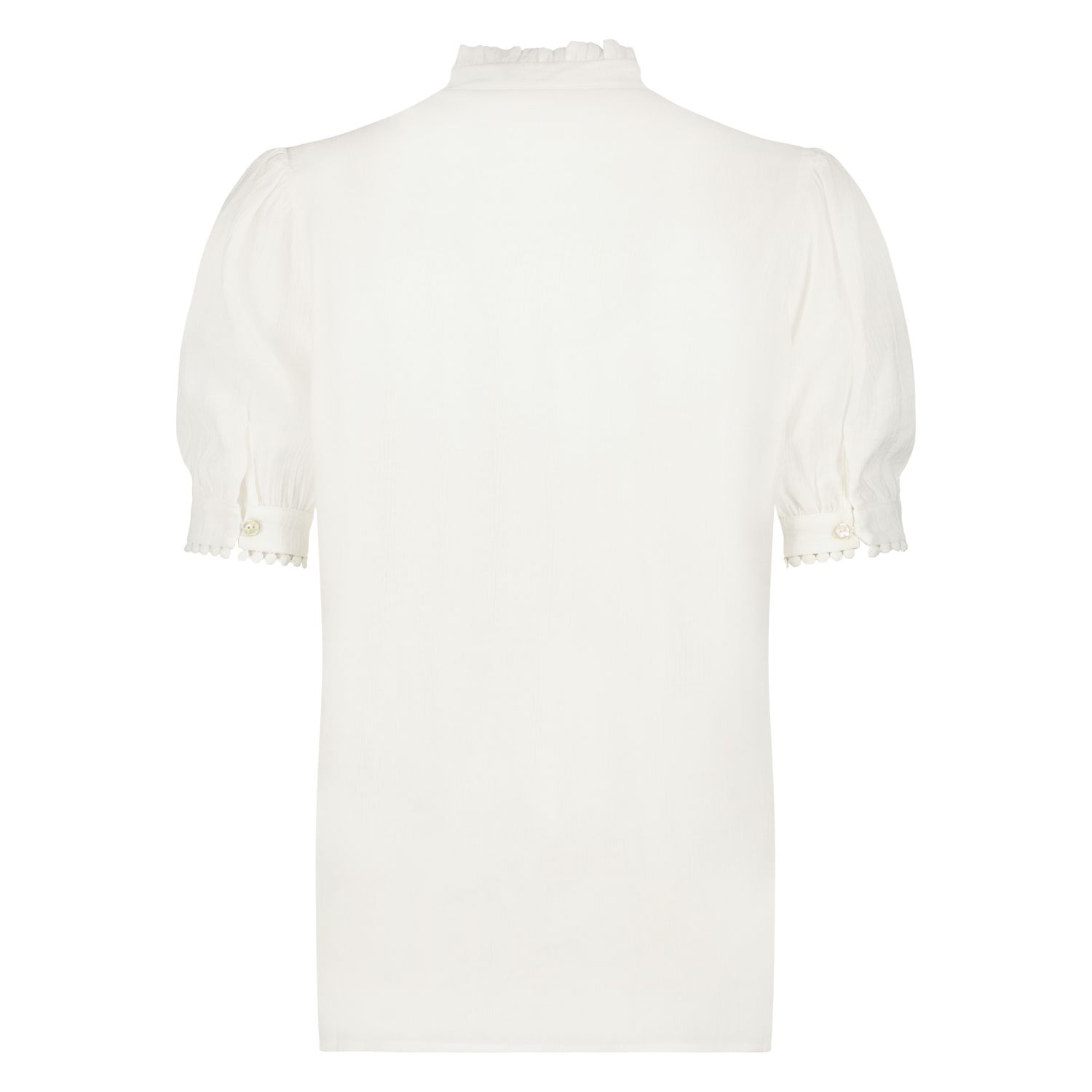 De Amelle blouse heeft korte mouwen en een opstaande kraag met een roezel.De blouse heeft een pofmouw en een leuk detail op de borst en aan de mouw uiteinden.