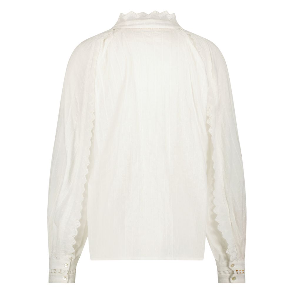 De Fa blouse heeft lange mouwen met een roezel en een opstaande kraag met een roezel. De blouse heeft een knoopsluiting met parelmoer kleurige knoopjes en een geborduurd patroon all over.