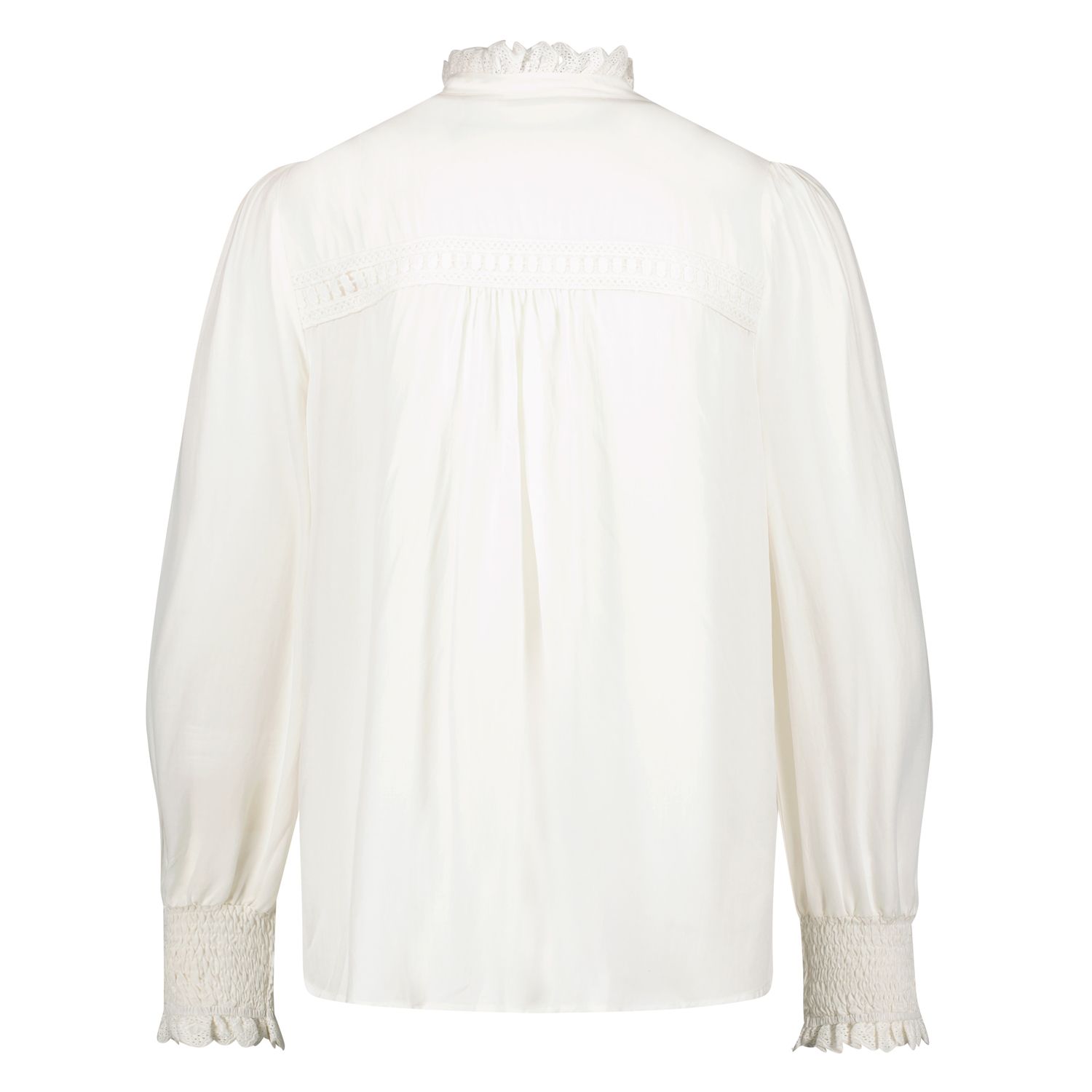 De Lana blouse heeft lange mouwen en een opstaande kraag met een roezel. De blouse heeft een detail op de mouw en schouder en heeft een knoopsluiting met goud kleurige knoopjes.