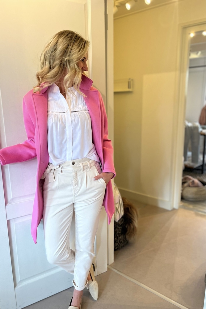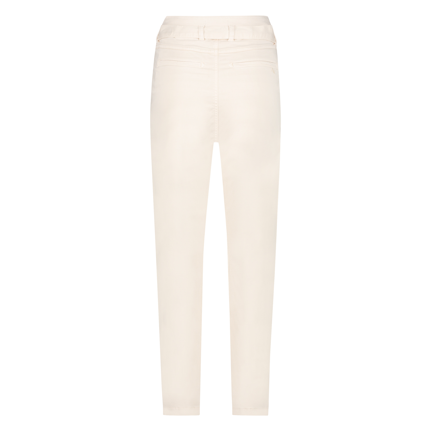 De Lisette pants is lange broek met een hoge taille, twee steekzakken aan de voorkant en twee paspelzakken aan de achterkant. De pantalon heeft een knoopsluiting en een wikkelriem in de taille.