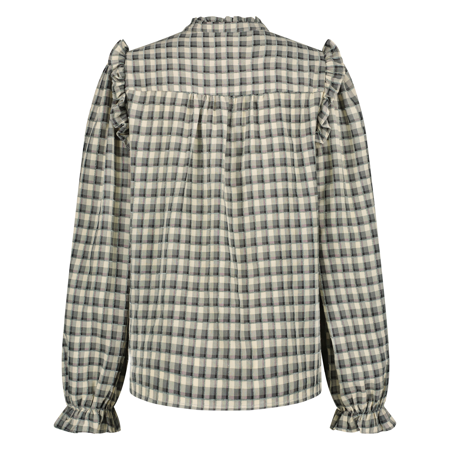 De Malagana blouse heeft lange mouwen en een lage kraag met roezel. De blouse heeft een overall print, een knoopsluiting en ruges op de schouders en borst. In de uiteinde van de blouse zit elastiek verwerkt.