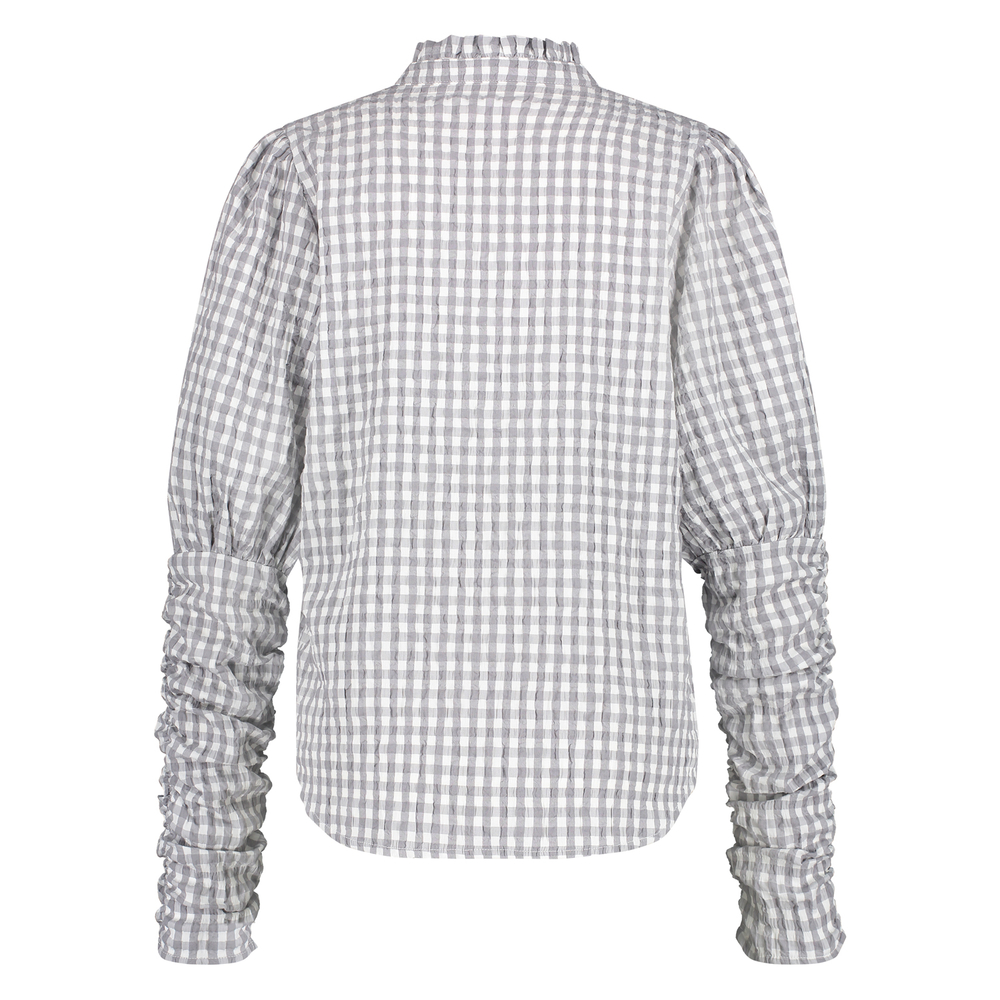 De Mao blouse heeft lange mouwen, een opstaande kraag met een roezel en een knoopsluiting met goud kleurige knoopjes. De blouse heeft een pofmouw en de mouwen zijn vanaf de helft gesmokt waardoor het een rimpelig effect krijgt.