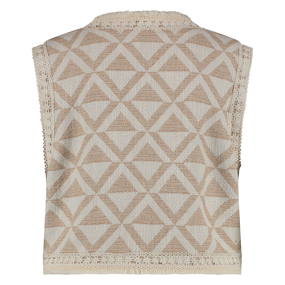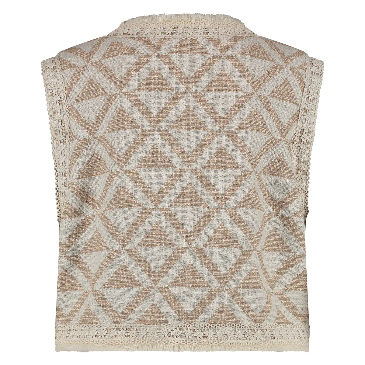 Het Meila gilet heeft een overall print met touwtjes om het gilet te sluiten. Rondom het gilet zitten franges en is gebruik gemaakt van een geborduurd detail. Maak je look compleet met dit toffe gilet.