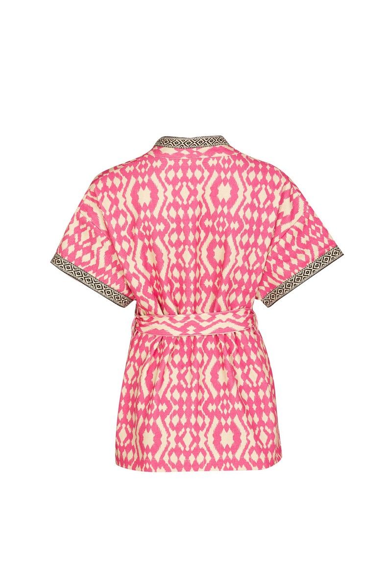 Het Cilia gilet is voorzien van een roze-witte print met bijpassende ceintuur, die speelsheid en elegantie uitstraalt.