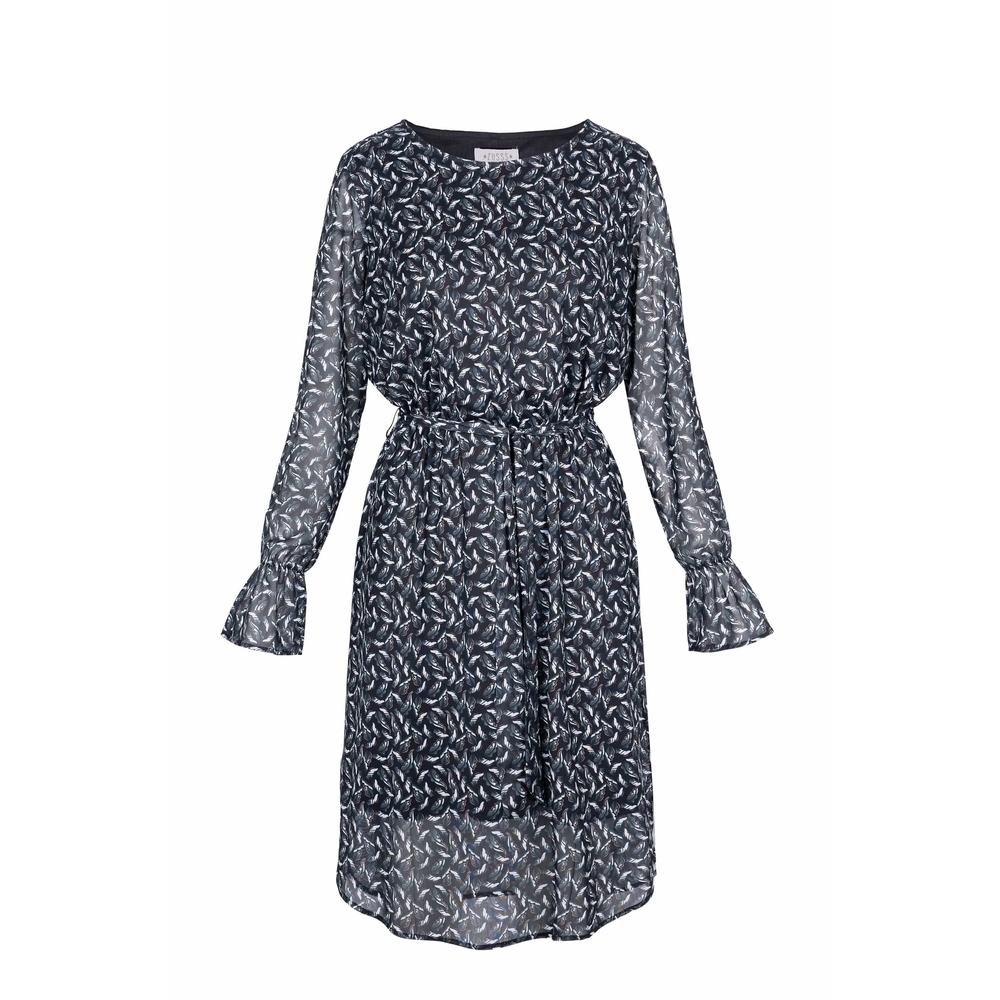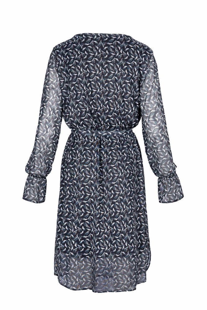 De jurk is zwart van kleur en voorzien van een leuk bladprintje. Het materiaal van de jurk bestaat uit 95% polyester en 5% elastaan, wat zorgt voor een transparante look. De transparante stof geeft de jurk een speelse uitstraling. Maar wees niet bang dat de jurk doorschijnt: hij is voorzien van een handige onderjurk! Aan de mouwen zitten leuke ruches verwerkt. Met het touwtje om de middel krijgt de jurk net iets