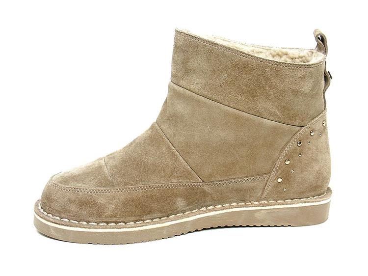 Kleur: Taupe Pasvorm: Valt normaal Materiaal buitenkant: Suede Materiaal binnenkant: Synthetische wol Materiaal voetbed: Synthetische wol Materiaal zool: Rubber Uitneembaar voetbed: Ja Kleur accessoires: Goud Ritssluiting: Nee Hakhoogte: 3cm