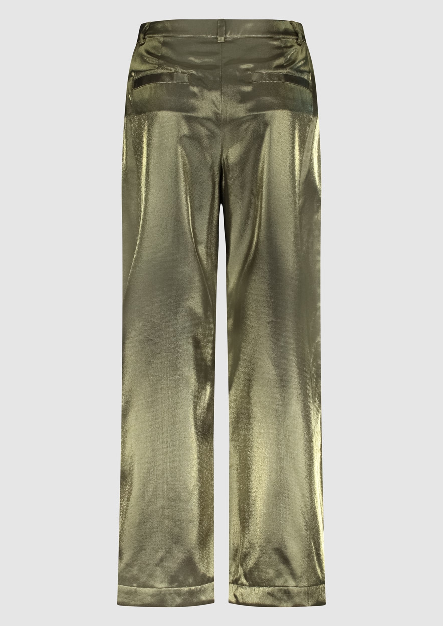 Wijdvallende dames pantalon met aan de buitenkant een satin look & feel. De Kiki pants is uitgevoerd in het groen/goud en voorzien van steekzakken en een front seam.