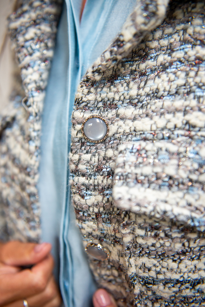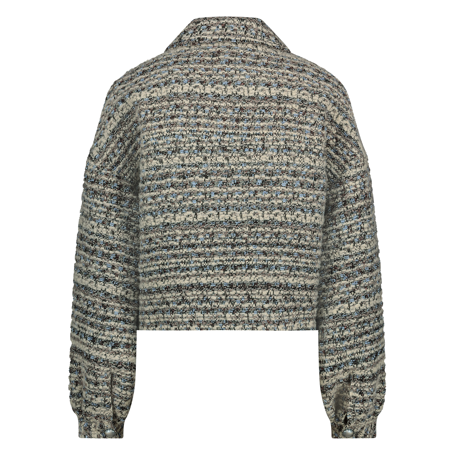 Het Harmony jacket is een kort jasje met drie knopen aan de voorkant en twee handige borstzakken. Het jasje heeft subtiele blauwe accenten en het is afgewerkt met twee knopen bij de mouwen voor extra detail.