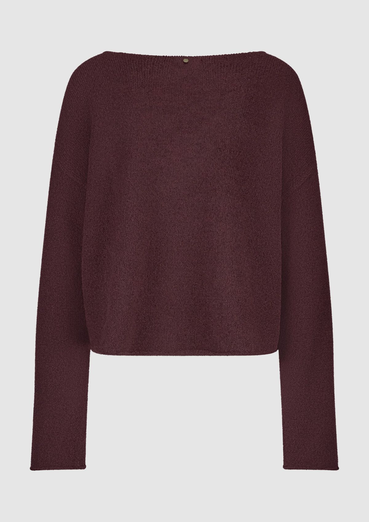 Zachte cropped dames trui uitgevoerd in wijn rood. De Liv knit heeft een oversized fit met een v-hals hals, drop shoulders en omgekrulde boorden.