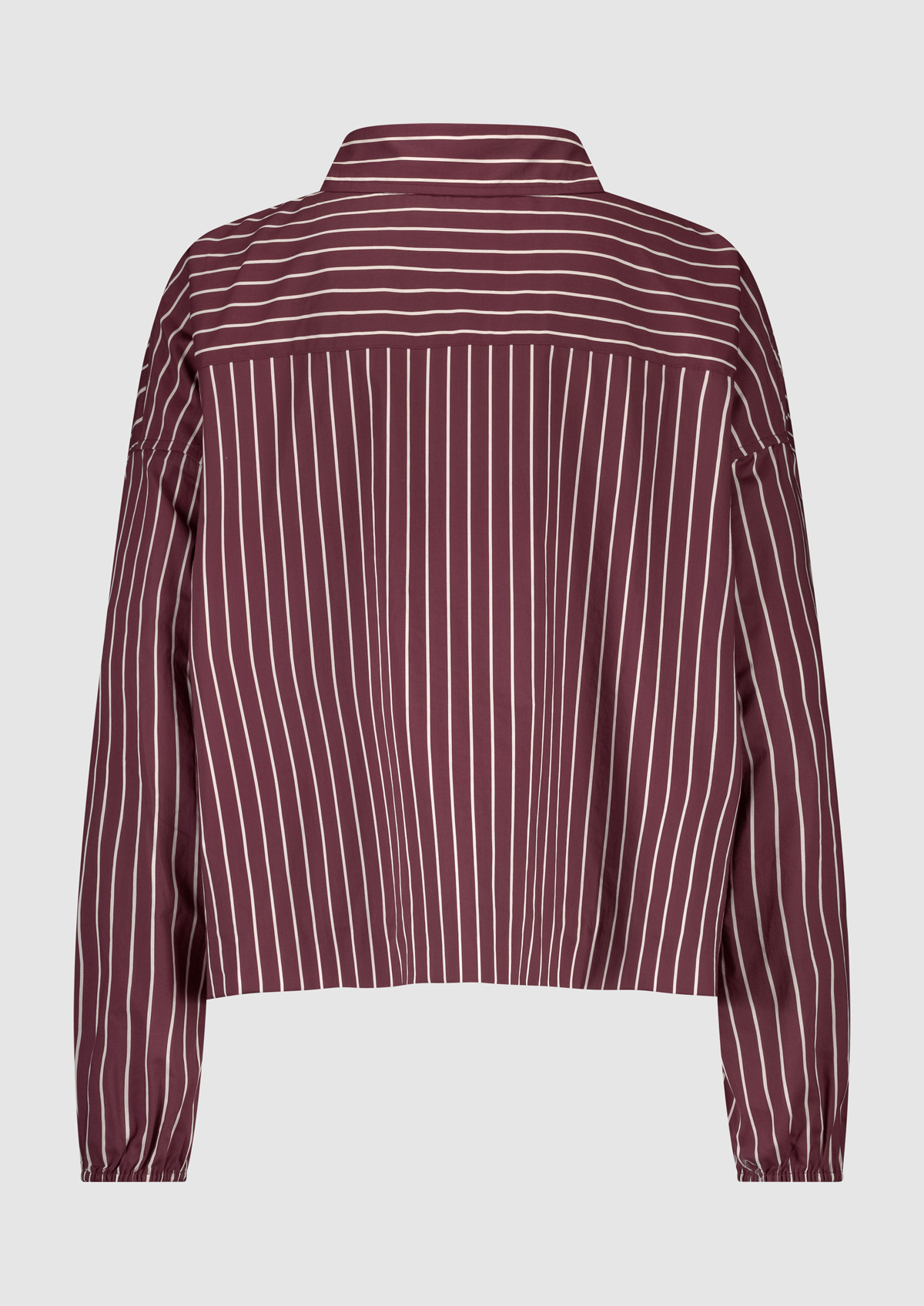 Dames top met een boxy fit en dropshoulders, uitgevoerd in het wijnrood met een wit streeppatroon. De Yana blouse heeft een losvallende fit met een knoopsluiting en kan aan de onderkant worden aangesnoerd met twee koorden voor een opgepofde look.