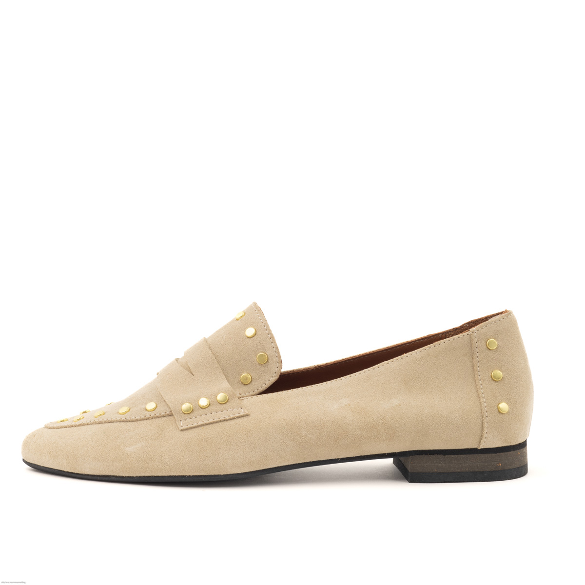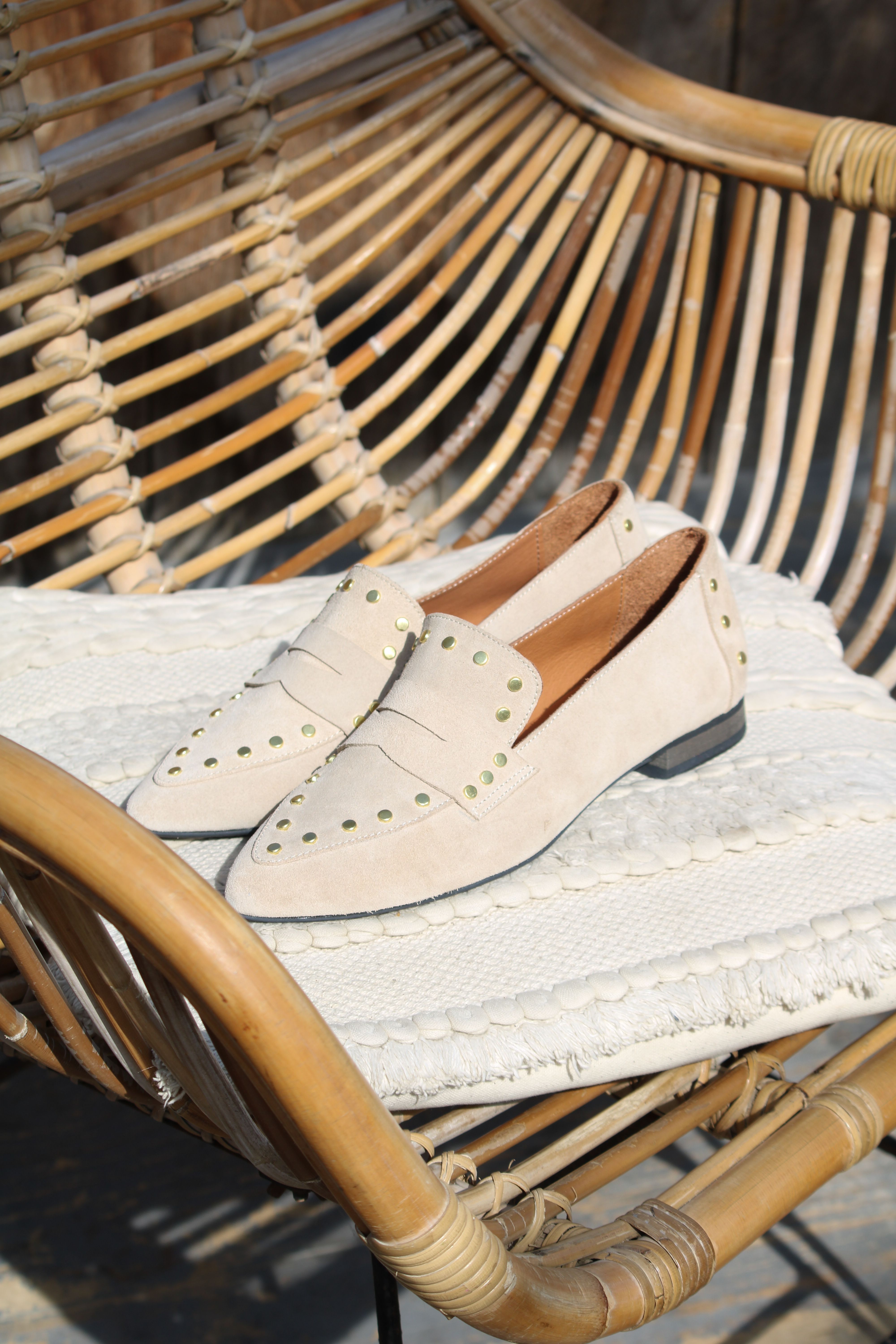 Deze luxe loafers van Babouche wissel je gemakkelijk tussen zakelijk en casual. Je combineert de populaire schoenen bijvoorbeeld met een jeans en een biker jack voor een edgy look of je draagt de schoenen in combinatie met een pantalon en een blouse voor een zakelijke look. Het model is voorzien van mat goudkleurige studs, en zijn gemaakt van luxebeige suede. De binnen voering is helemaal van leer, en heeft een comfortabele hak (1,5 cm).