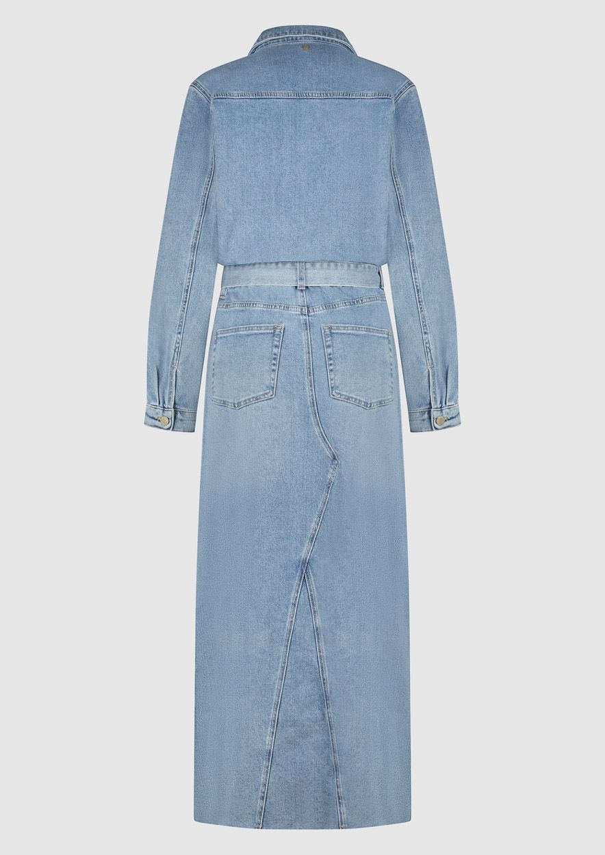 Lange spijkerjurk uitgevoerd in een vintage blauwe denim. De Bella jurk heeft aan de voorkant een knoopsluiting en een elastische tailleband met een bijpassende ceintuur.