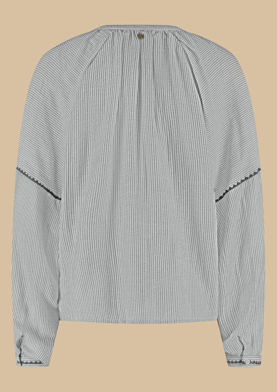 Zomerse blouse uitgevoerd in een donkerblauw met wit verticaal streeppatroon. De Everlee blouse heeft een loose fit met een v-hals, knoopsluiting en donkerblauwe details.