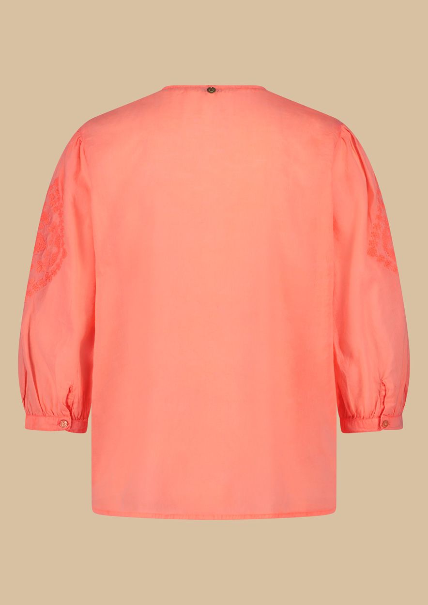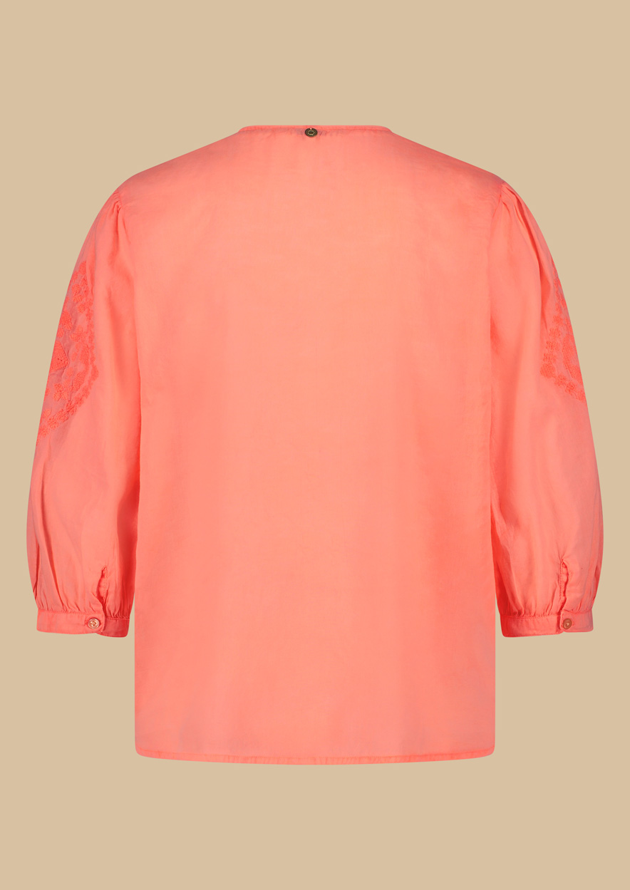 Licht doorschijnende katoenen blouse uitgevoerd in fel koraal. De Heather blouse heeft een loose fit, v-hals, broderie details en decoratieve koorden met een kwastje. Beschikbaar in meerdere kleuren.
