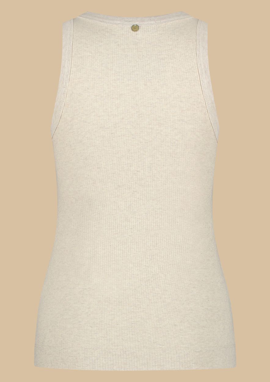 Mouwloze dames top gemaakt van geribd katoen. De Jada top heeft een aangesloten fit, ronde hals en is uitgevoerd in het beige melange.