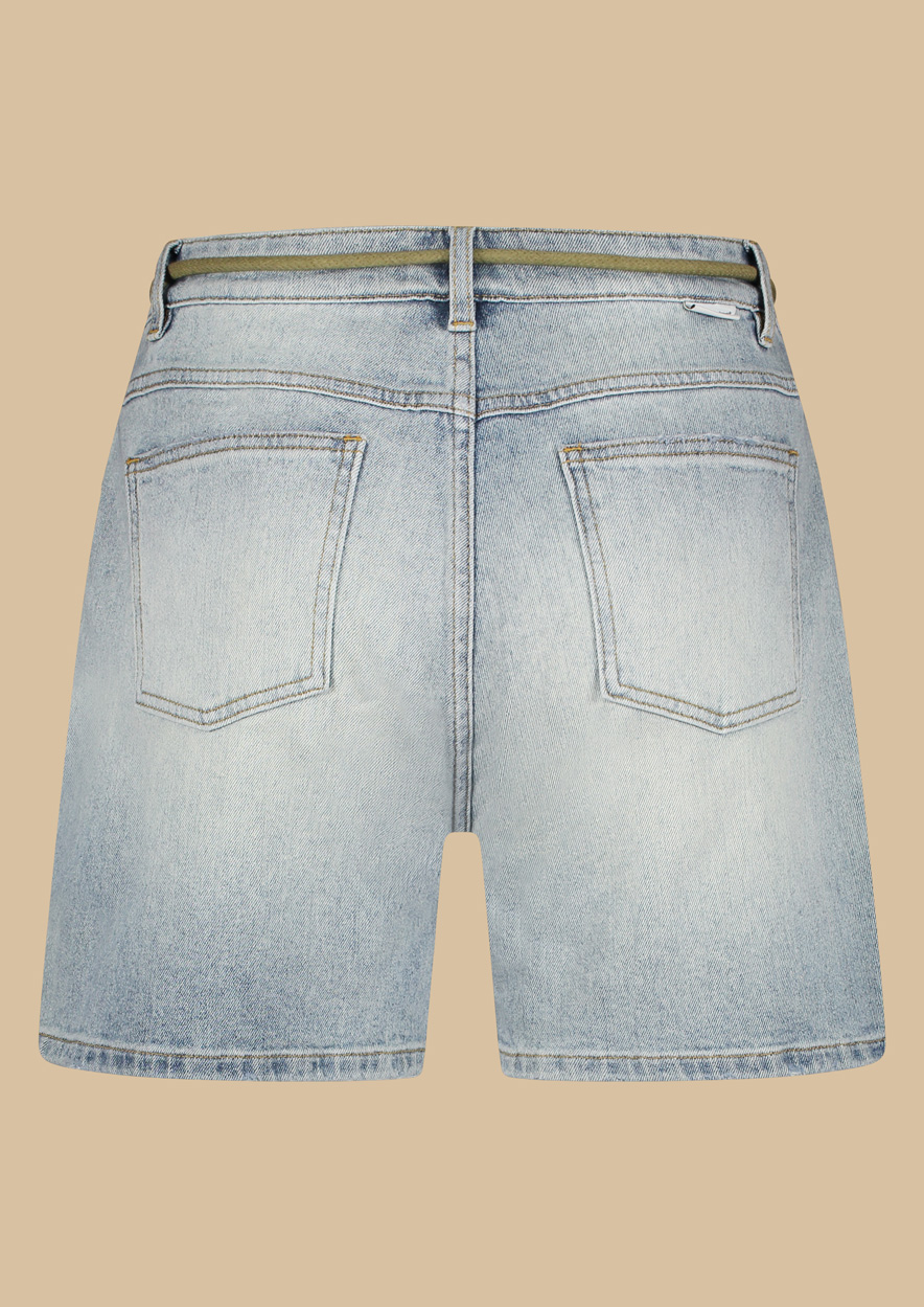 Loose fit denim short, gemaakt in een vintage lichtblauwe wassing. De Rosie short heeft een ritssluiting en een tunnel met groene veter.