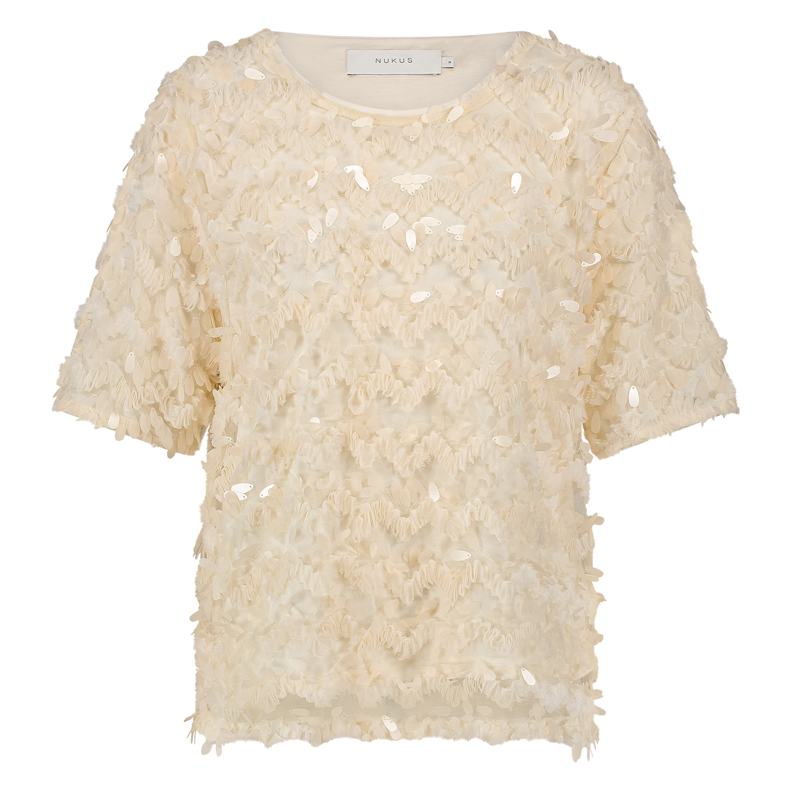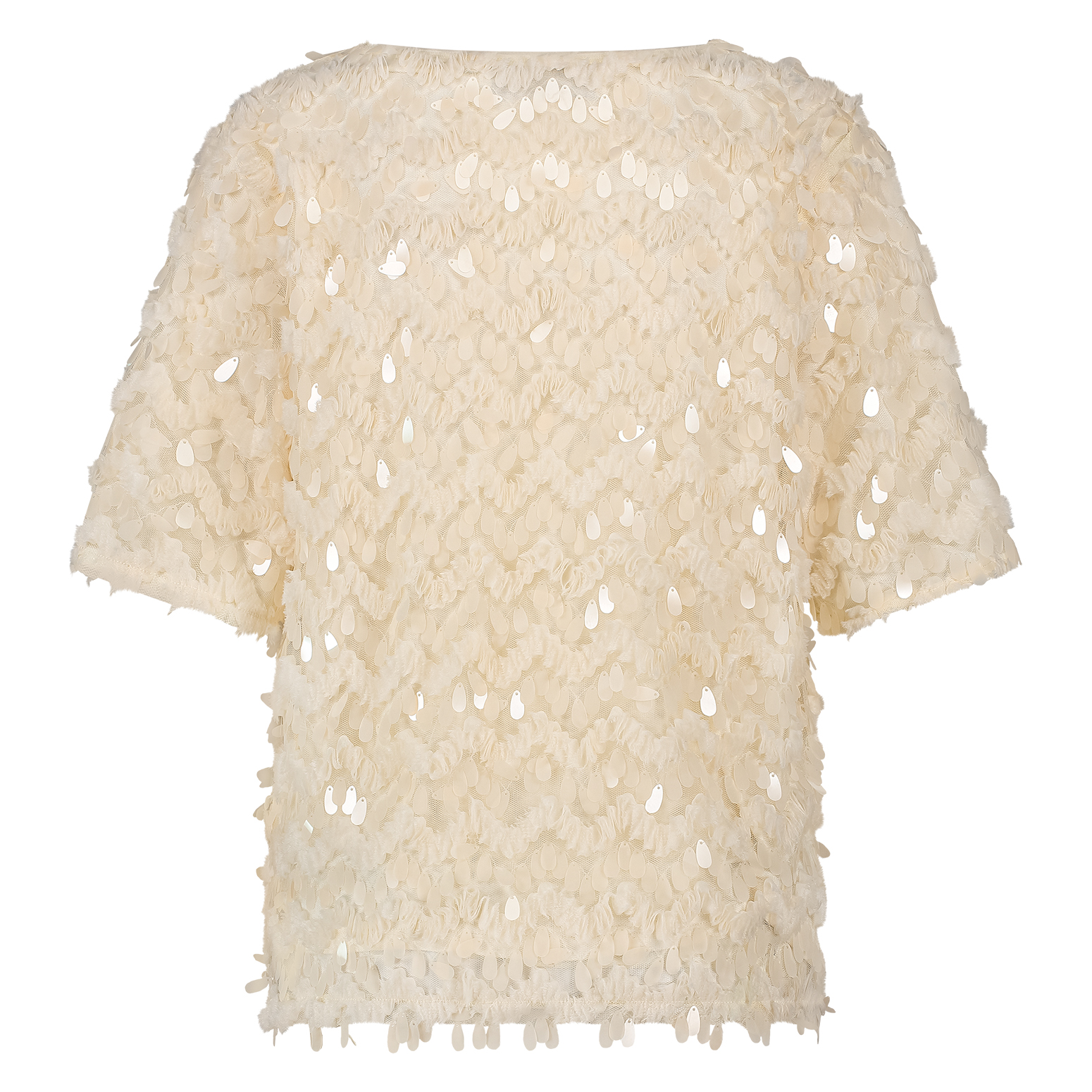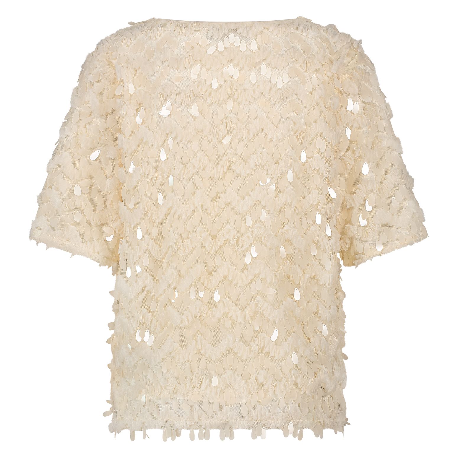 De Aria Top Lace in off white is de ideale mix van draagcomfort en een feestelijke uitstraling. Gemaakt van 100% polyester, biedt dit t-shirt een zachte en lichte pasvorm, perfect voor het voorjaar. De paillettenafwerking zorgt voor een verfijnde, sprankelende touch, waardoor de top zowel geschikt is voor alledaagse outfits als speciale gelegenheden.