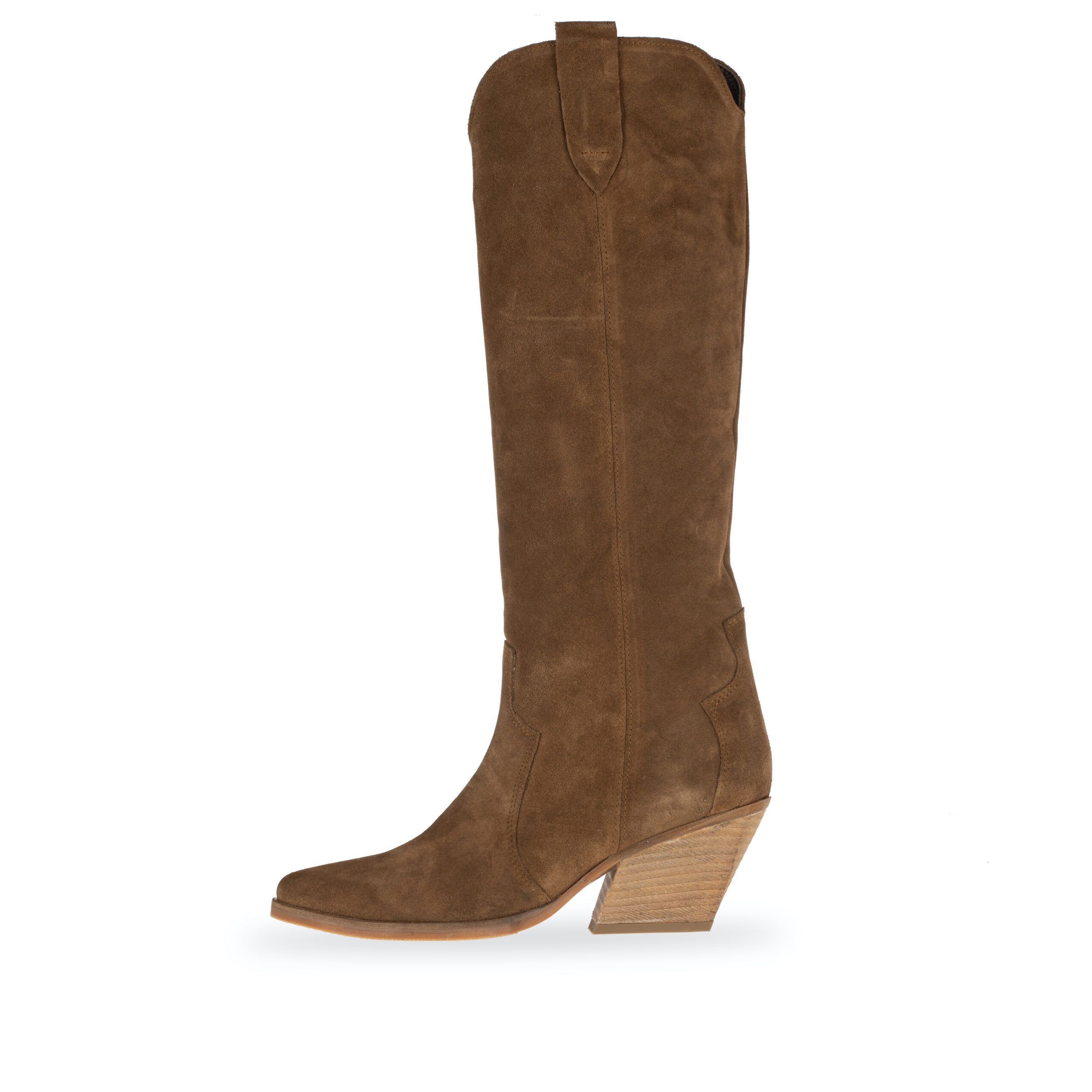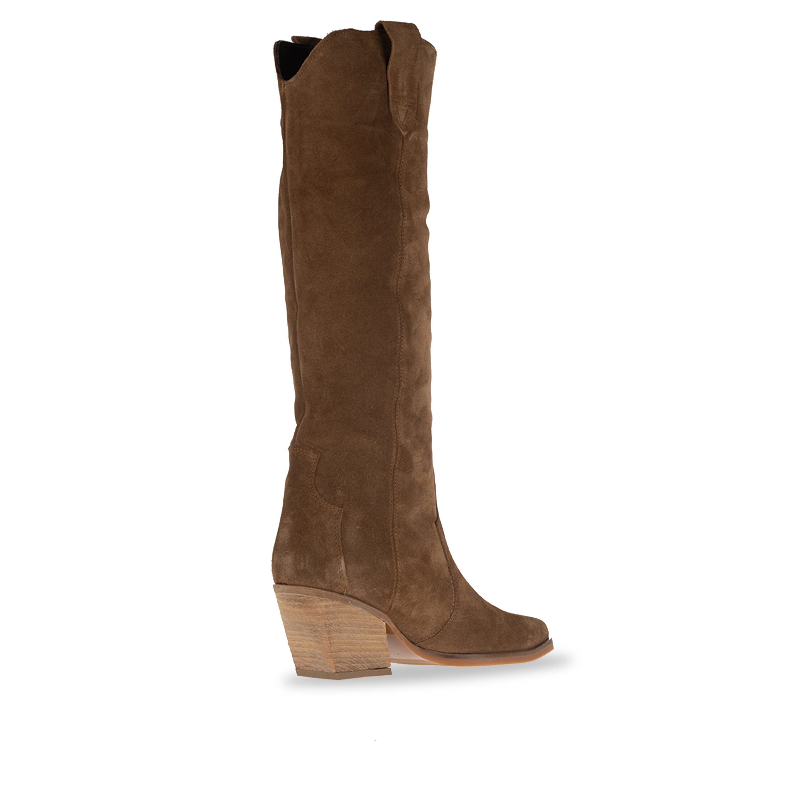 Ga voor een opvallende, stoere look met deze lange laars met cowboy-accenten! Dit city western model heeft een afgeronde schacht met aantreklussen, een spitse neus en een stevige schuine blokhak bekleed met leer. Het bovenwerk is uitgevoerd in soepel suède en de binnenvoering is ongevoerd met een leer vast voetbed. De rubberen zool geeft de laars een goede grip. De schacht is 42 centimeter hoog gemeten bij maat 37. Draag ze leuk met een rok of jurk!