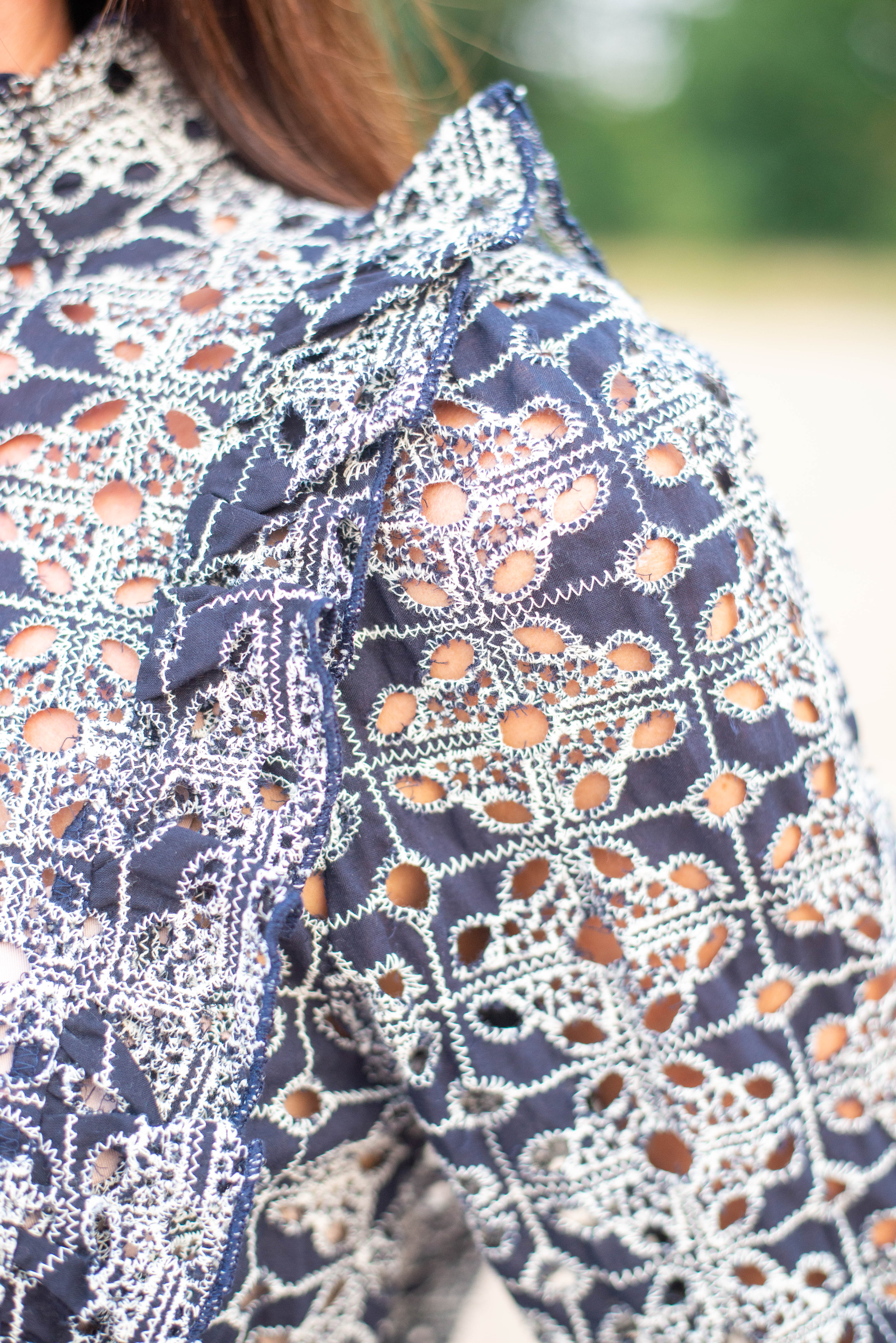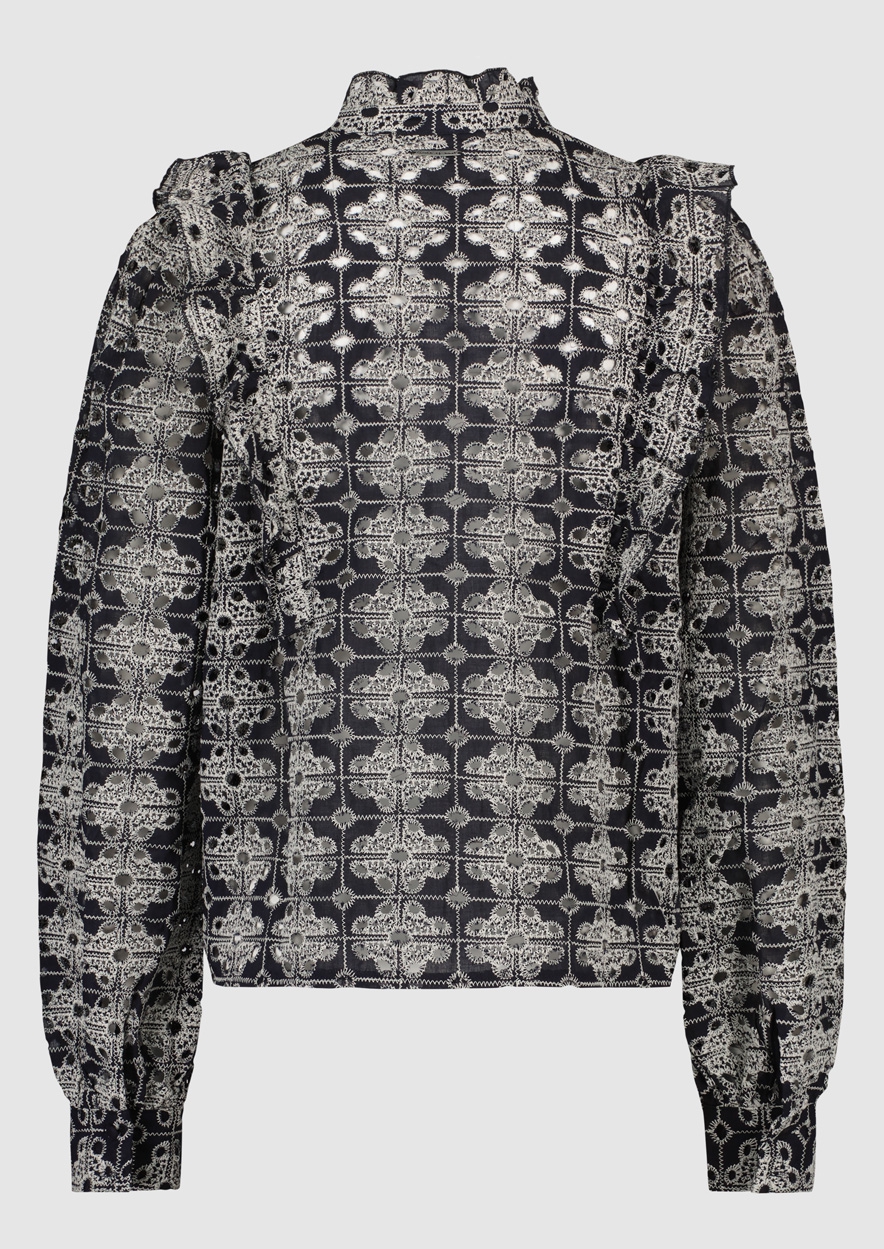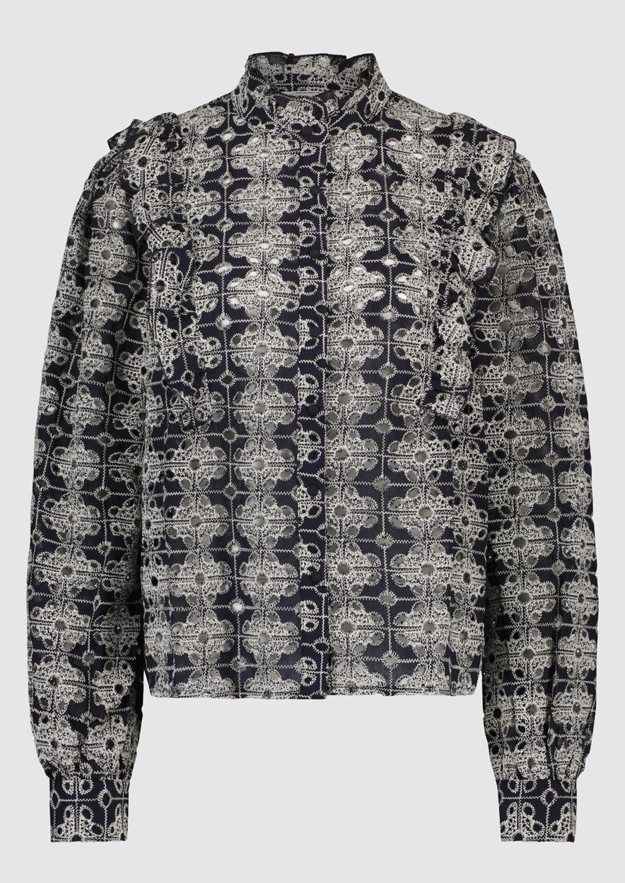 Donkerblauwe blouse met een wit gestikt all-over patroon met openingen.