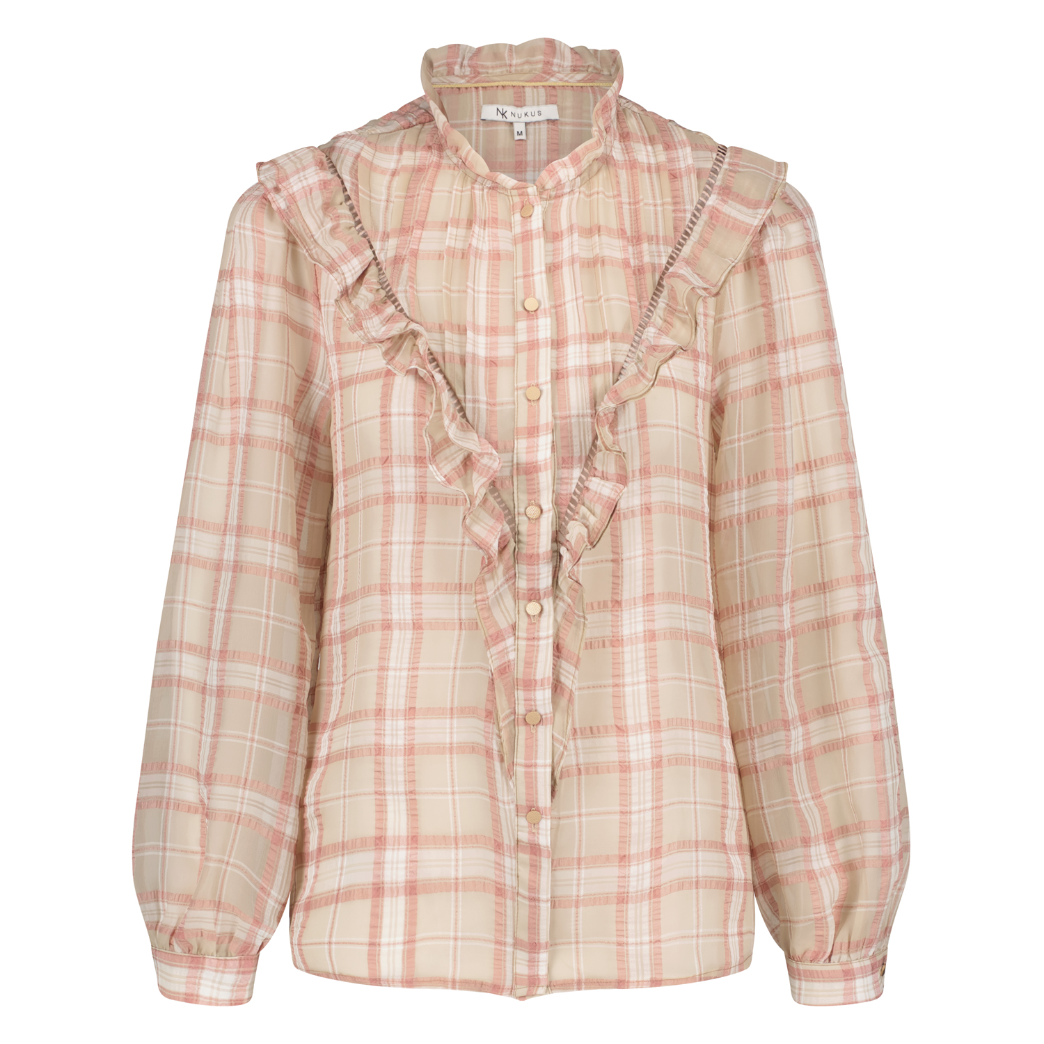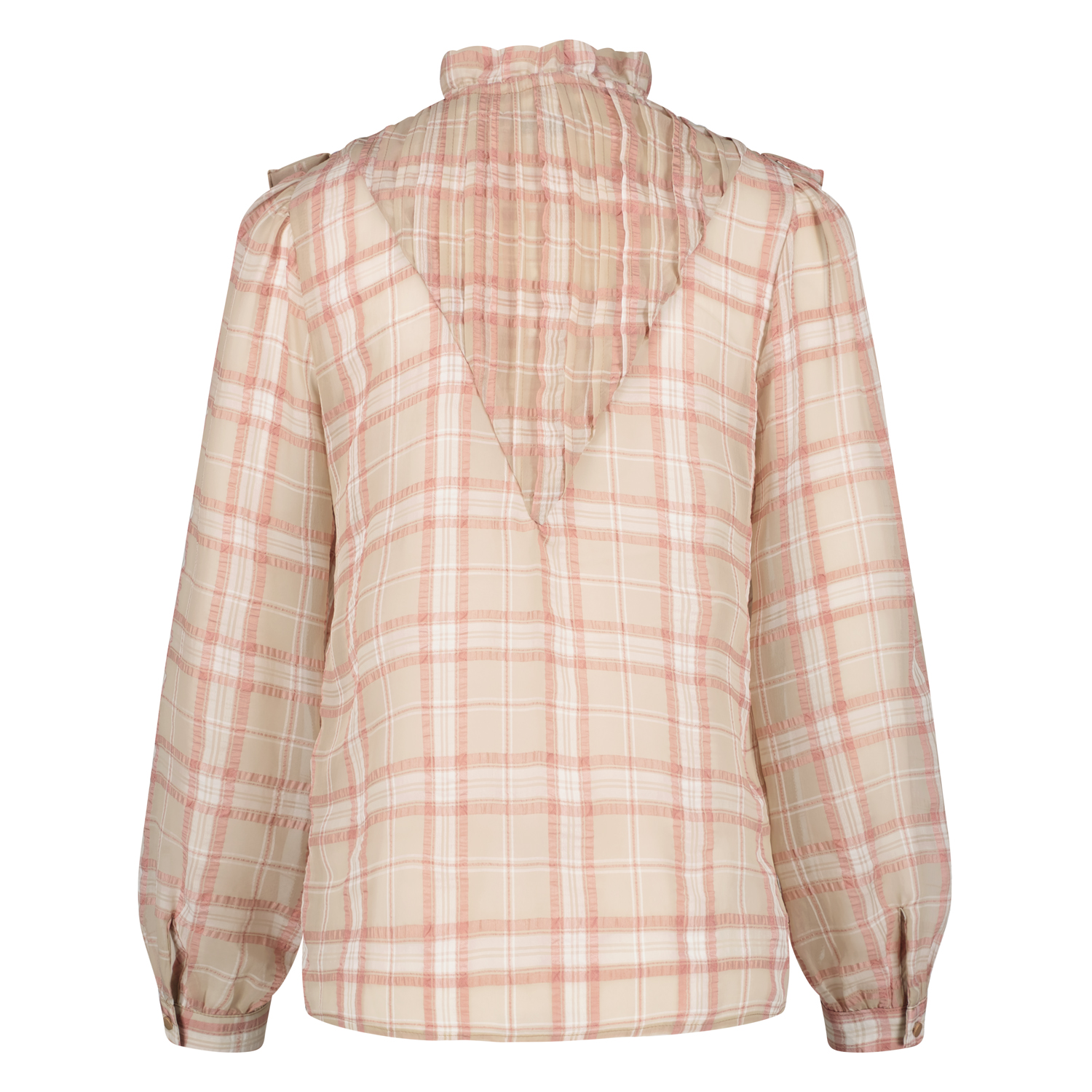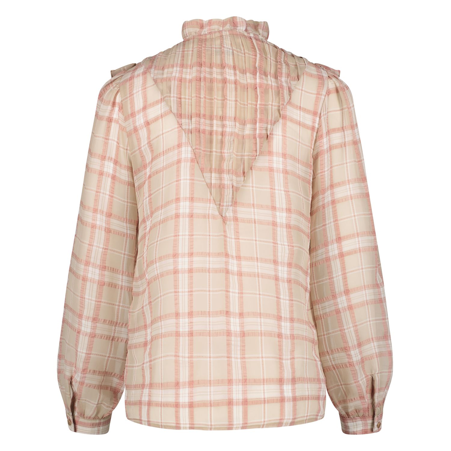 De Laura blouse heeft lange mouwen, een overall print, een platte kraag met opengewerkte details en gouden knoopjes. De blouse heeft ruches en opengewerkte details, ook op de achterkant.