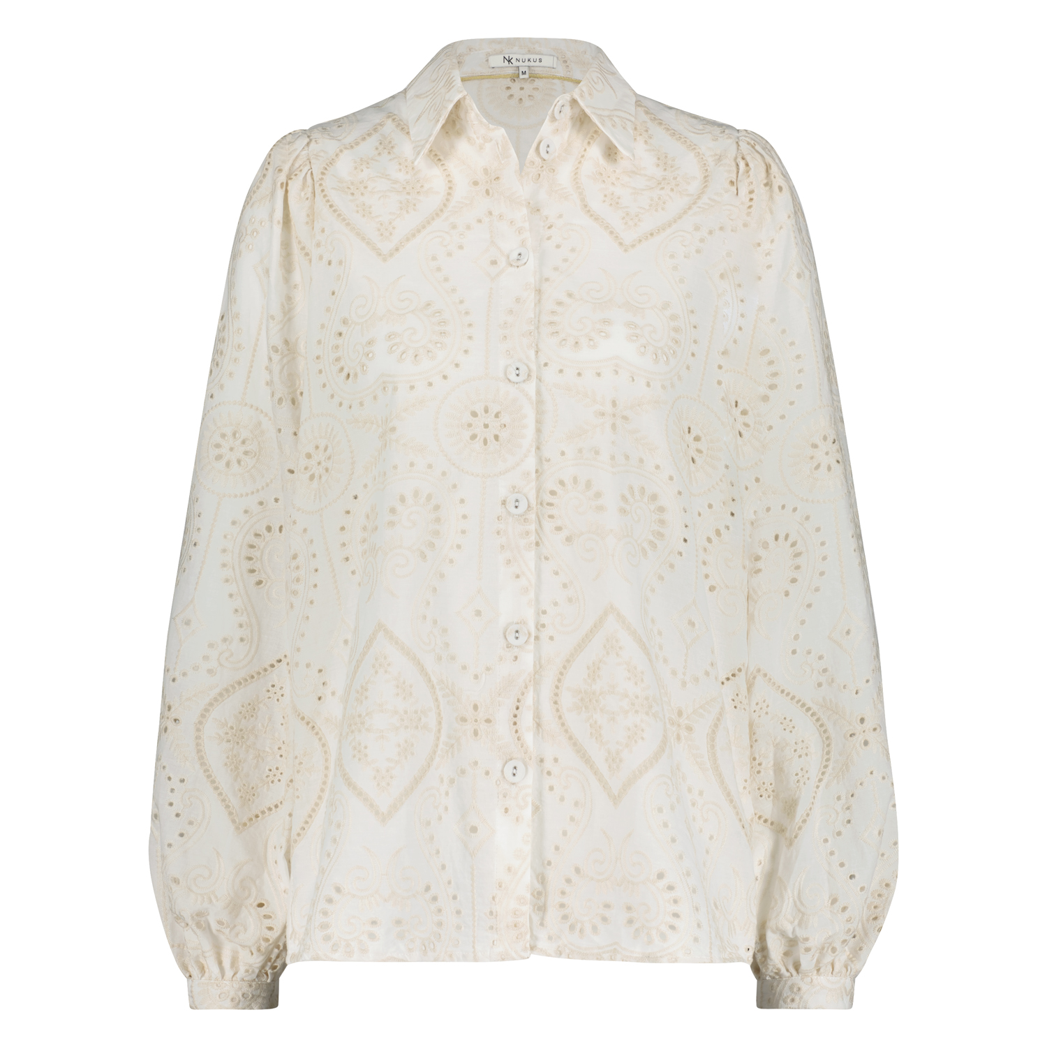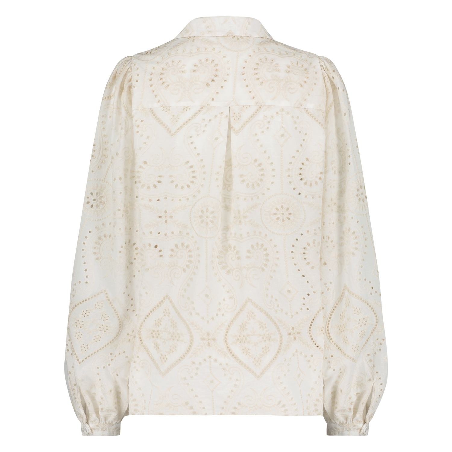 De Lettie blouse heeft lange mouwen en een kraag. De blouse heeft een overall print met een knoopsluiting en op het voorpand ingestikte plooitjes.