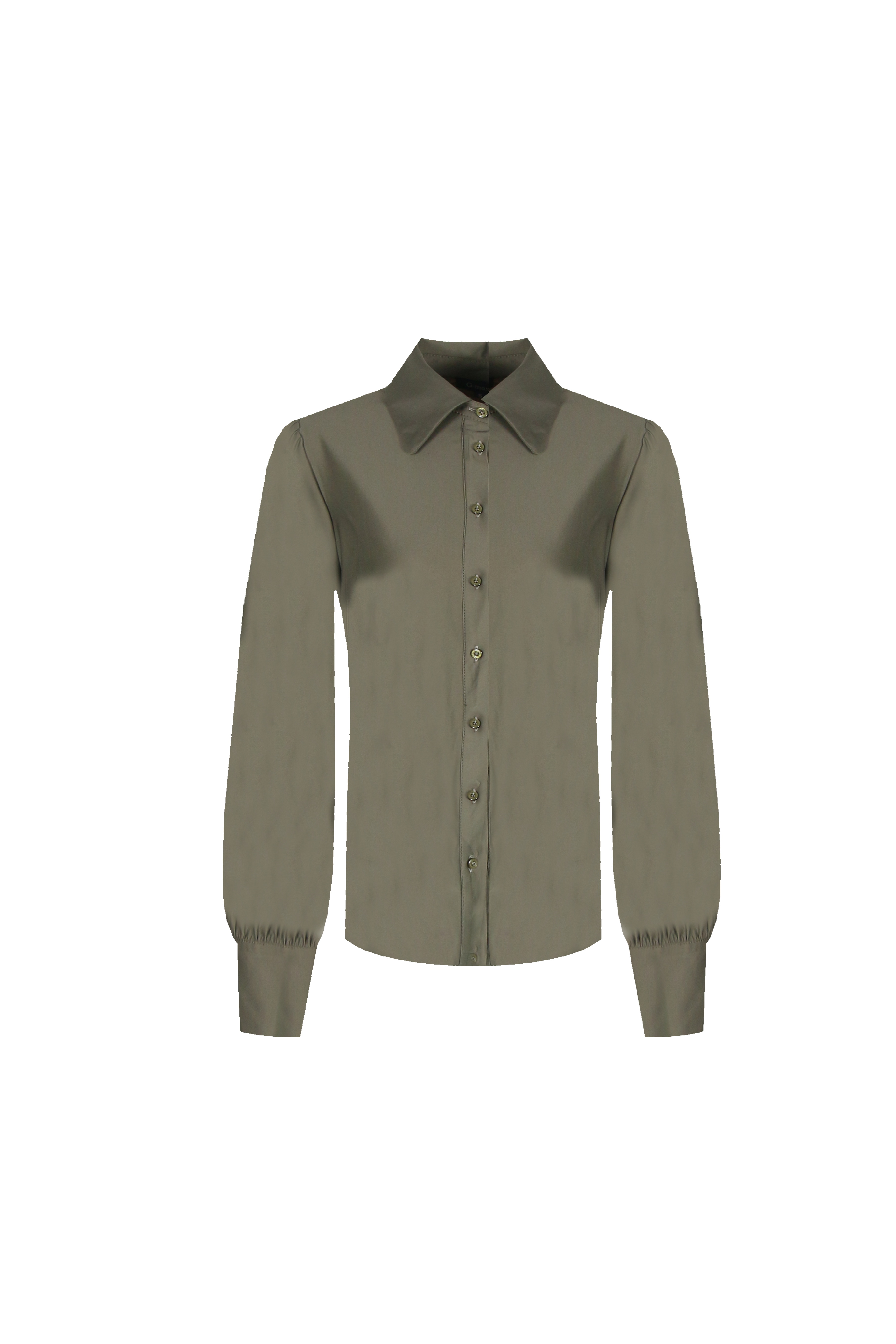 Deze perfecte basic heeft een klassieke kraag met een pof mouw op de schouder.