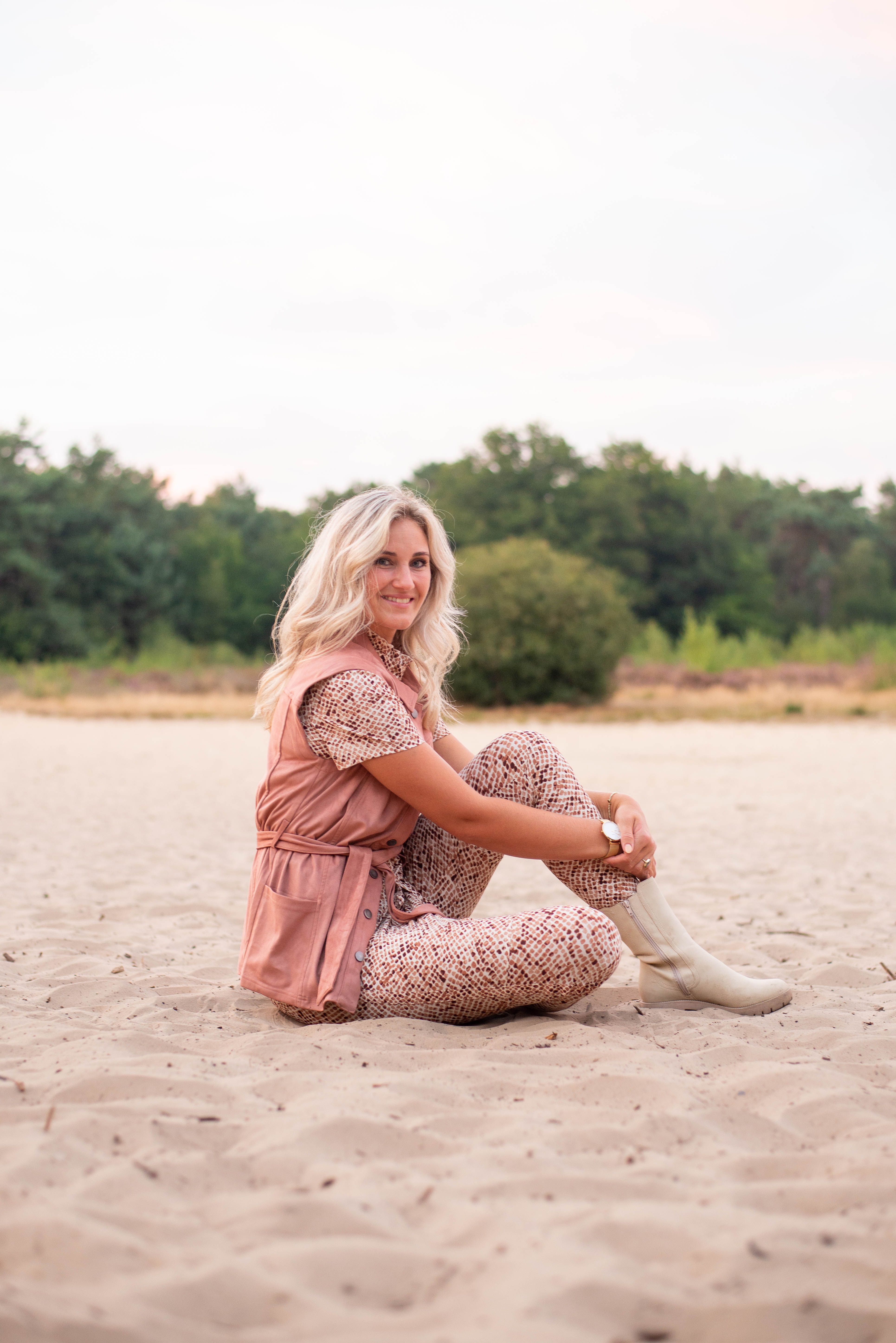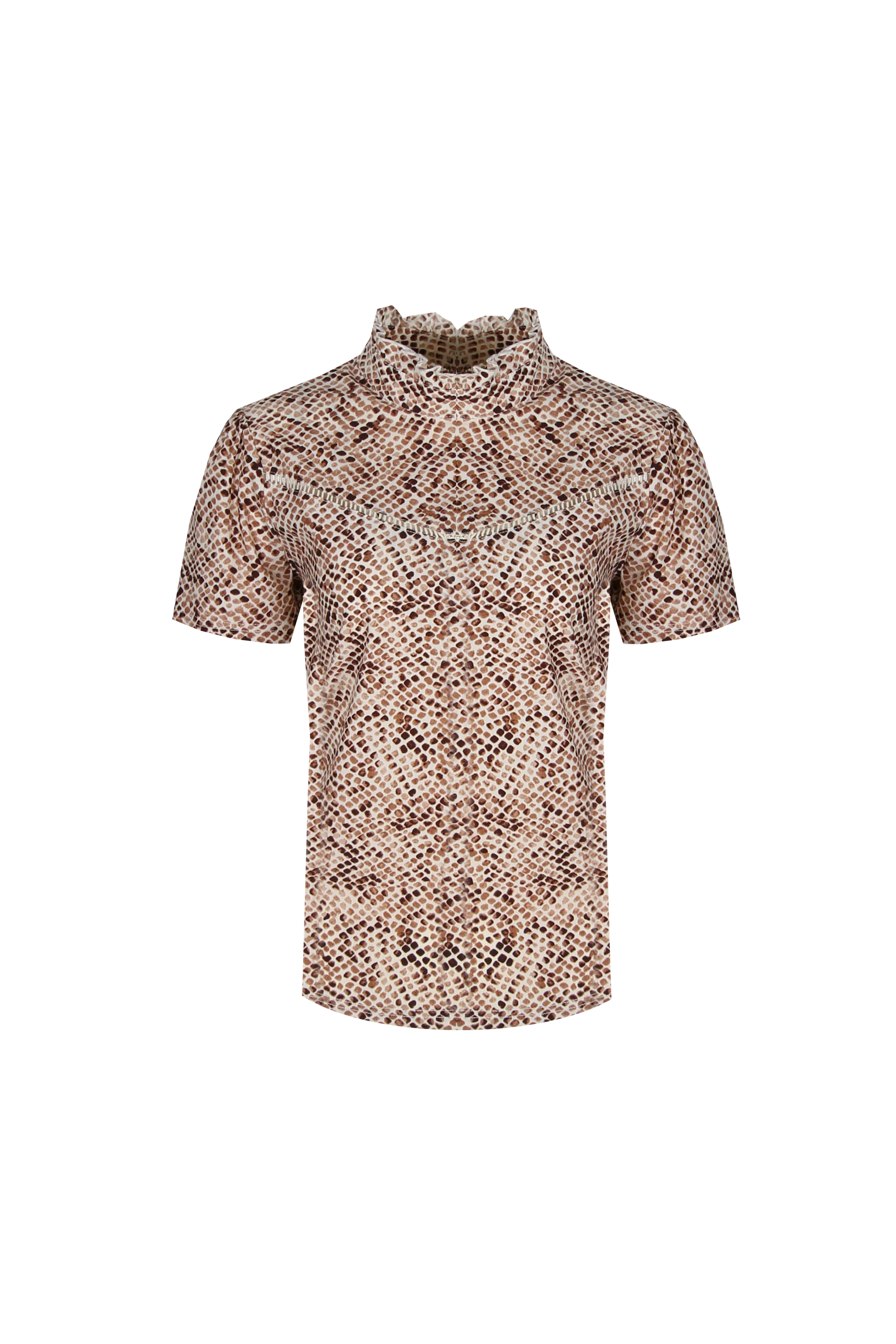 De top heeft korte mouwen, een ruffle kraag en een opgebreide strook op de borst.