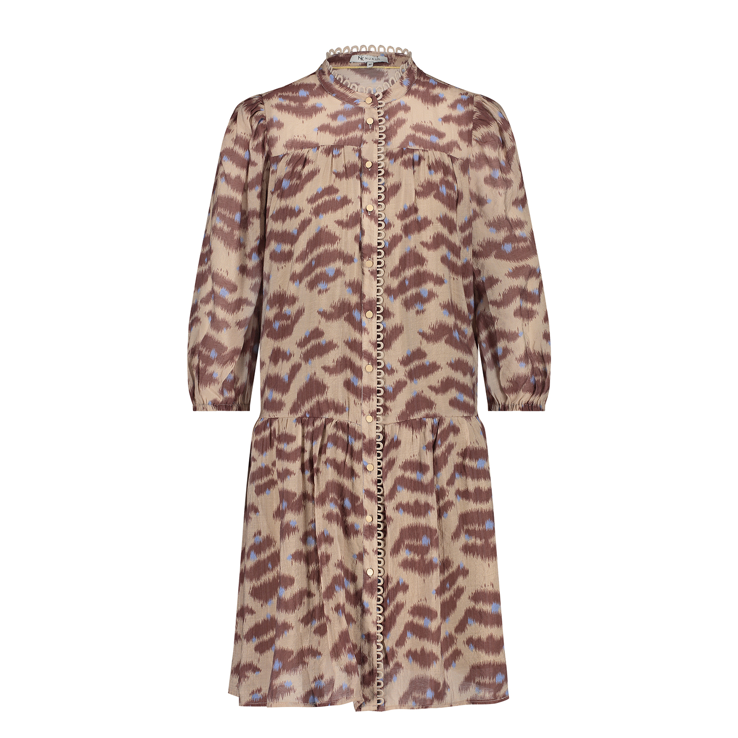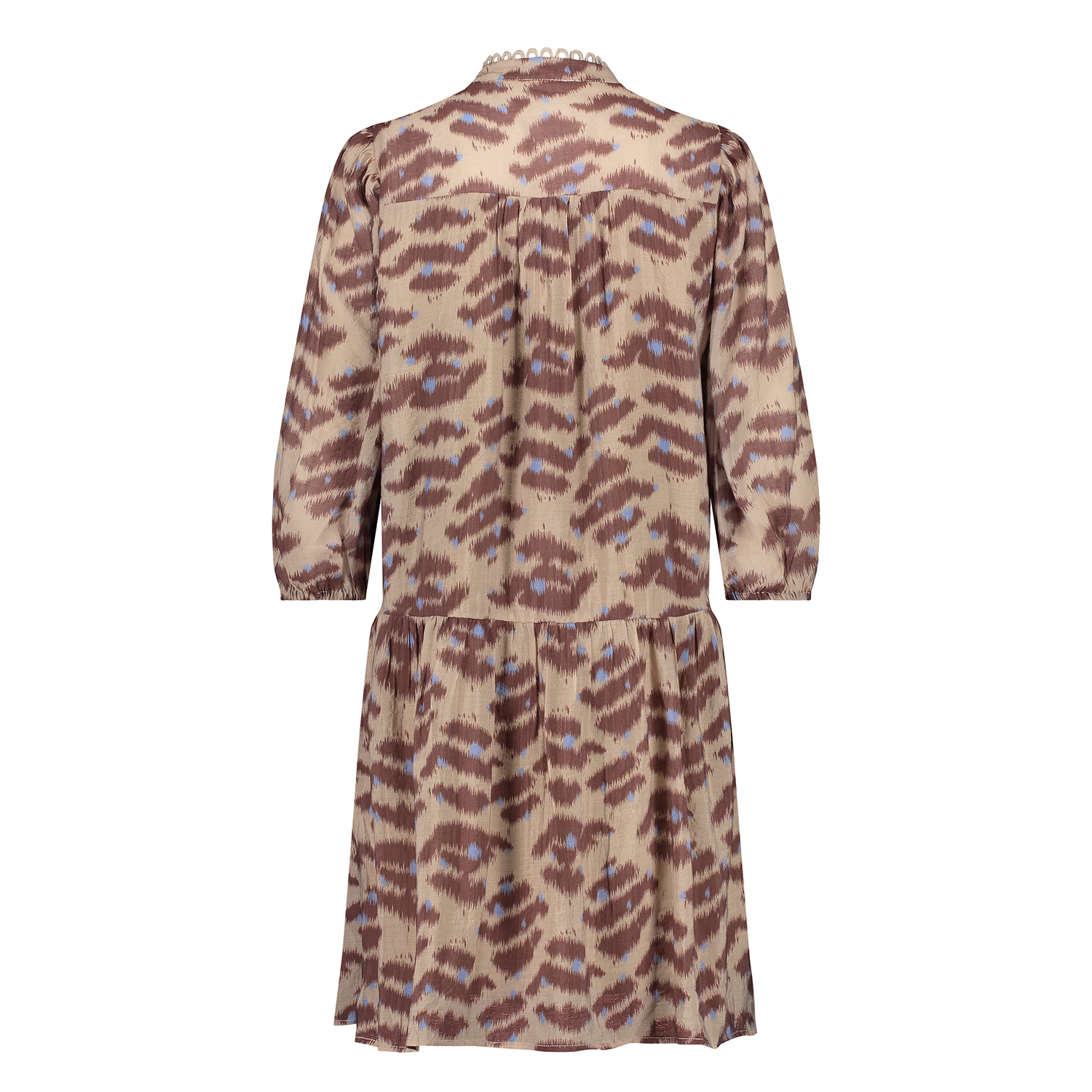 De Fallon dress is een korte jurk met (door)knoopsluiting met een overall print. De Jurk heeft een driekwart pofmouw met elastiek aan de uiteinden. Door de lichte stof draagt deze lekker comfortabel!