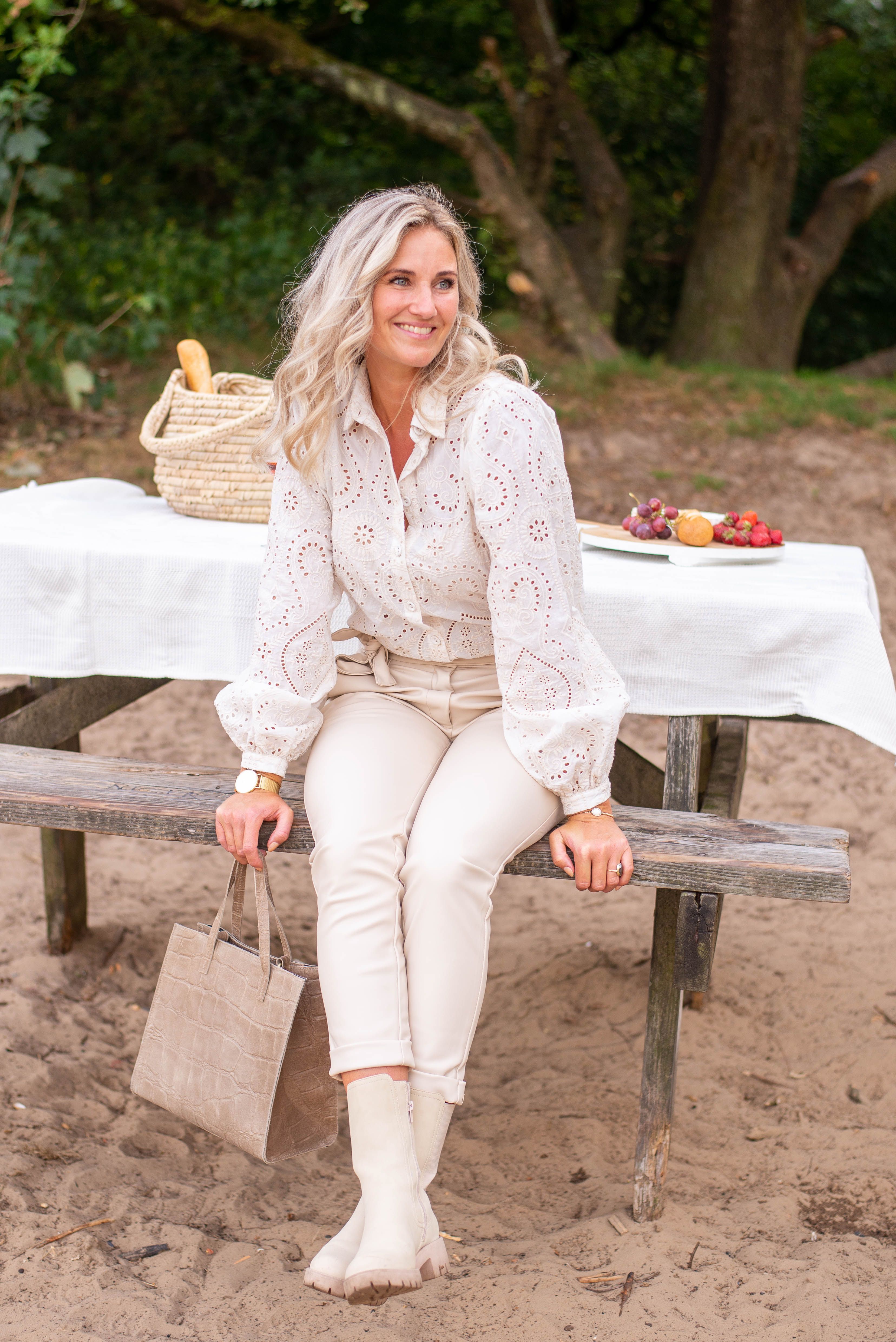 De Lettie blouse heeft lange mouwen en een kraag. De blouse heeft een overall print met een knoopsluiting en op het voorpand ingestikte plooitjes.