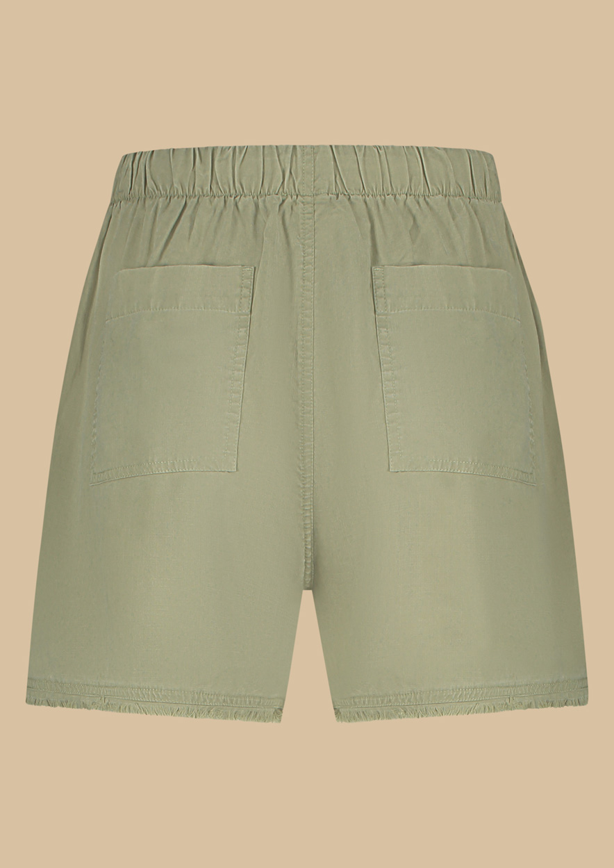 Luchtige taupe dames short gemaakt van zacht lyocell. De Serena short heeft een loose fit met een elastische tailleband en trekkoord. Afgewerkt met rafels aan de onderkant.