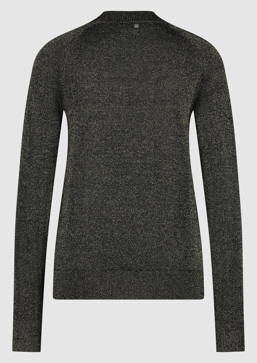 Dun gebreide dames trui met een aangesloten fit en een ronde hals, uitgevoerd in het zwart. De Ann knit heeft een metallic gouden draad erin geweven en een dikker boord aan de onderkant en mouwuiteinden. .