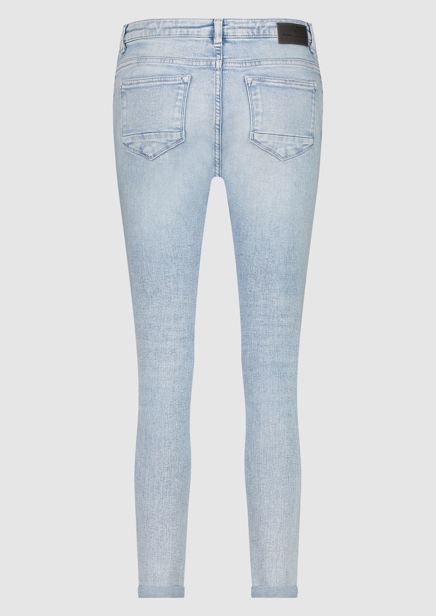 Skinny boyfriend fit denim met een mid-rise. De Cooper is gemaakt van stretch katoen in een lichtblauwe wash met damage details. Deze jeans wordt geleverd met een gevlochten riempje.