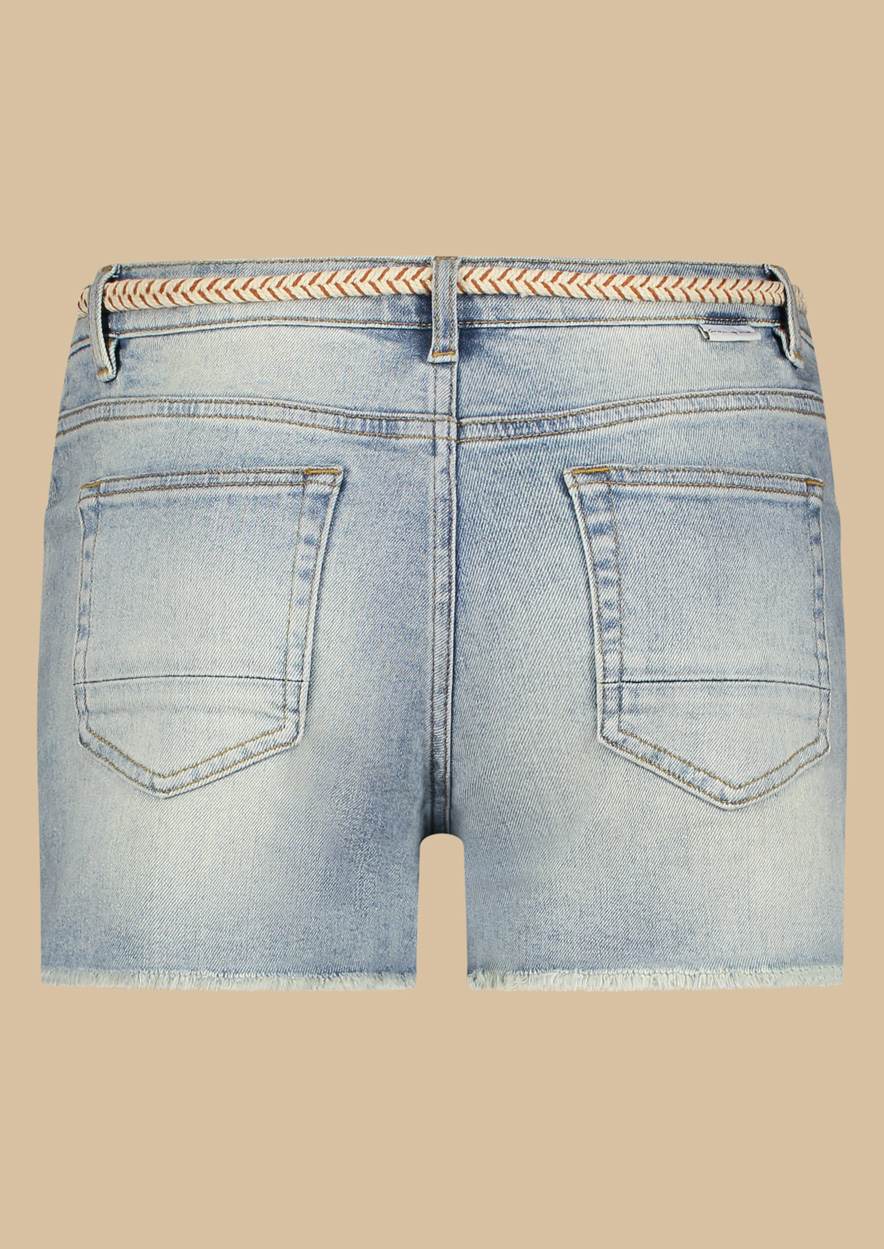 Lichtblauwe denim short gemaakt van stretch katoen. De Stevie short wordt geleverd met een gevlochten riempje van crème met terracotta.