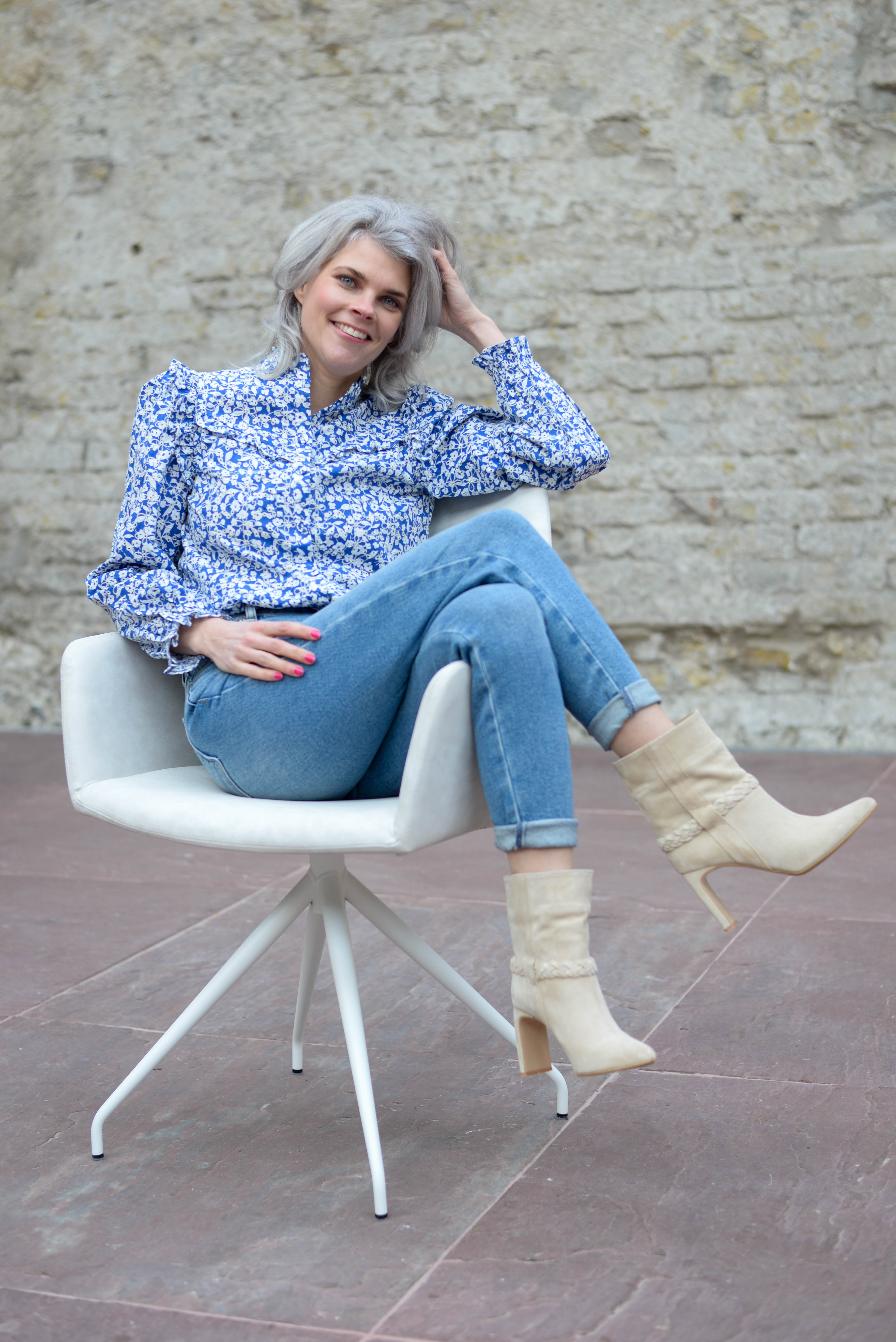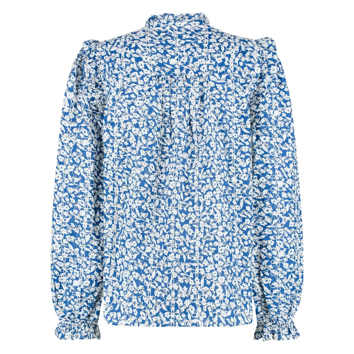 De Malagai blouse heeft lange mouwen en een roezel bij de kraag. De blouse heeft een overall print met een knoopsluiting, een detail op de borst en aan het uiteinde van de mouw ingestikte plooitjes.