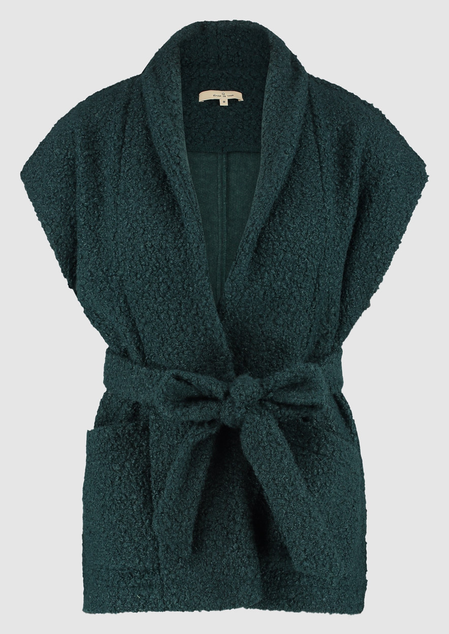 Zacht bouclé gilet uitgevoerd in een petrol blauwe tint. Het Dolly gilet heeft een loose fit met een open voorkant, steekzakken en een bijpassende ceintuur.