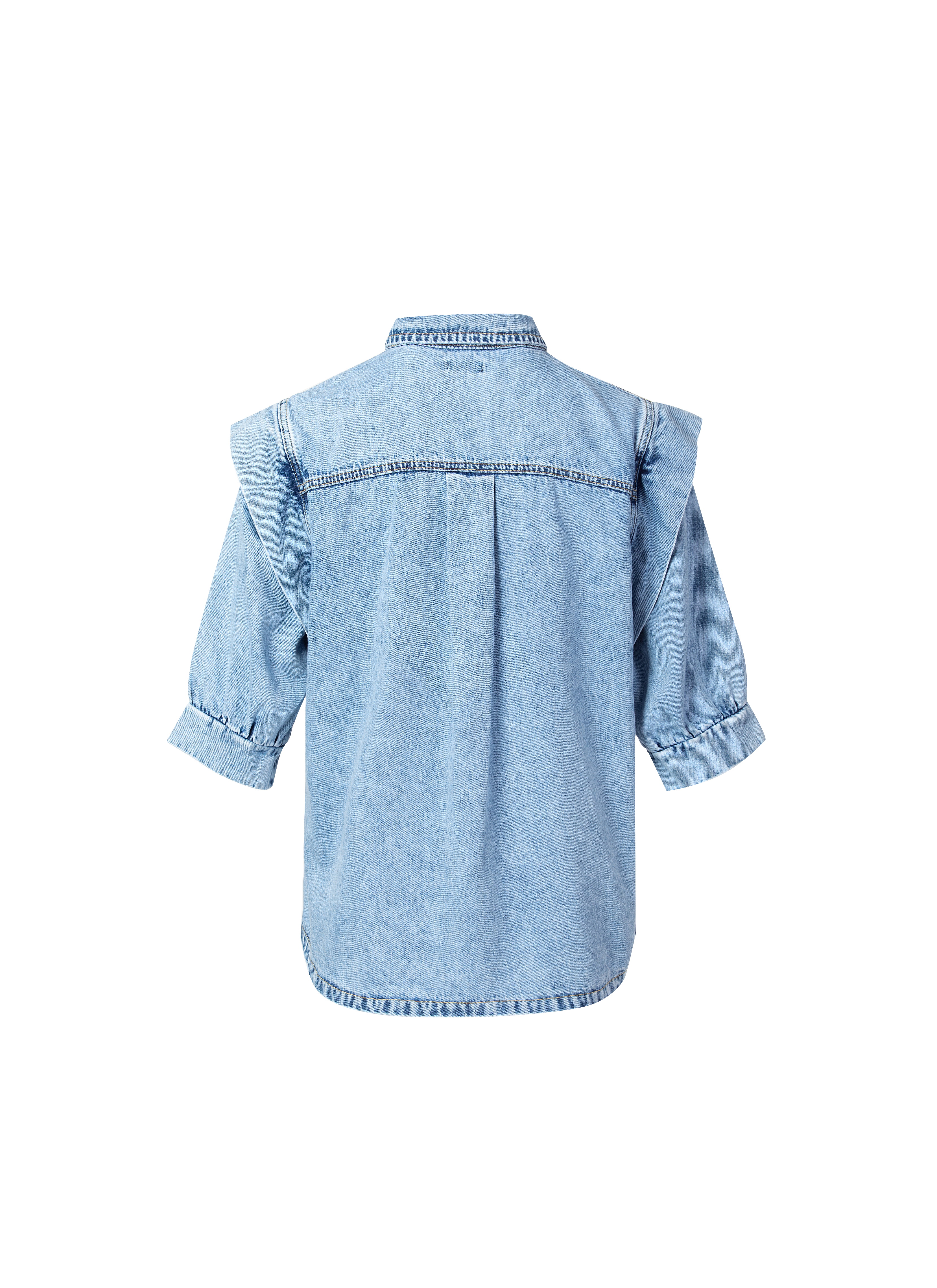De Nena denimblouse heeft een kortemouw en een leuk detail op de schouder. De blouse is voorzien van een knoopsluiting met parelmoerkleurige drukknoopjes.