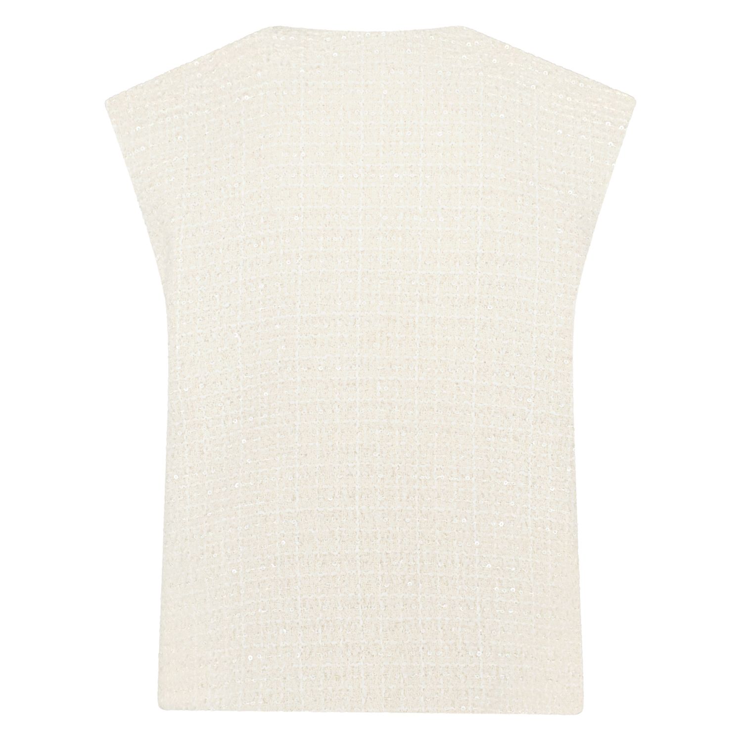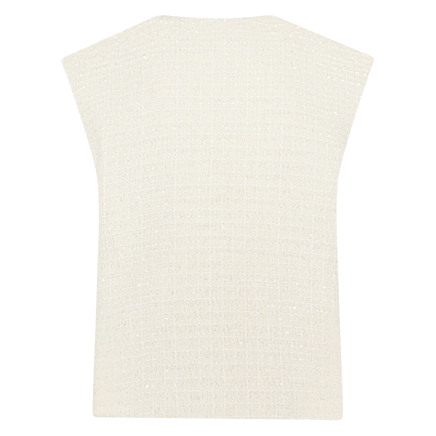 Wij zijn fan! De Arabella gilet white is een echte toevoeging aan elke outfit! Met double chest pockets, gemaakt van tweedstof met golden waffle button en een kleine kapmouw kan deze niet missen!